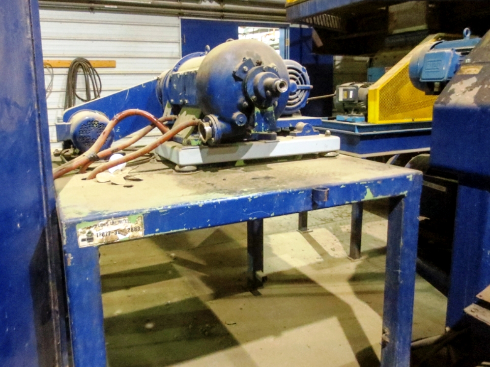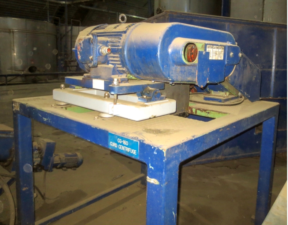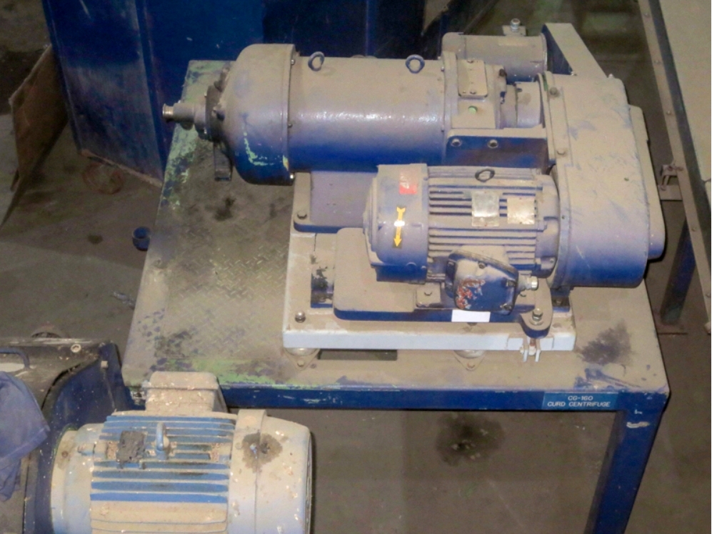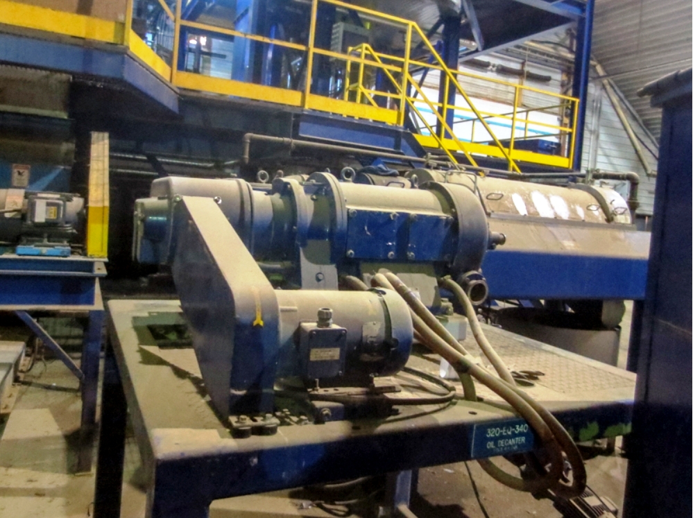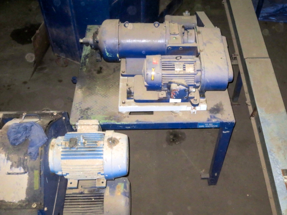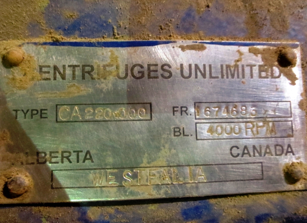 Max bowl speed 4000 RPM, flat angle bowl, effluent discharged by gravity. wear liners on cake ports, 1.5" single lead hardsurfaced conveyor, 15 HP motor 550/3/60, cyclo gearbox, guard, feed tube, vibration isolators and sub-base. Mounted on a stand. Very good condition. 1985 vintage. Prior use: Food plant; still installed. FCA Canada.