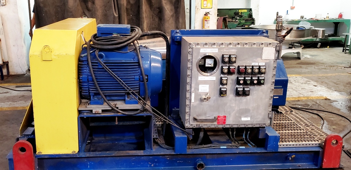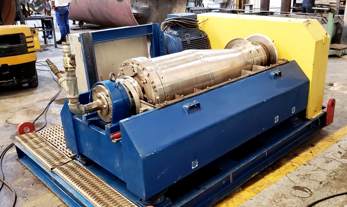 Max bowl speed 3000 RPM, 2300 G's, rated @ 110 GPM. 6.25" single lead hardsurfaced conveyor, 45 KW motor 460/3/60/1750 RPM, 52:1 cyclo gear, feed tube and guards, mounted on skid with XP control panel. 2012 vintage. Very good condition. FCA South America.