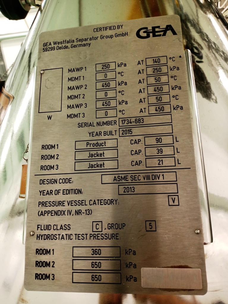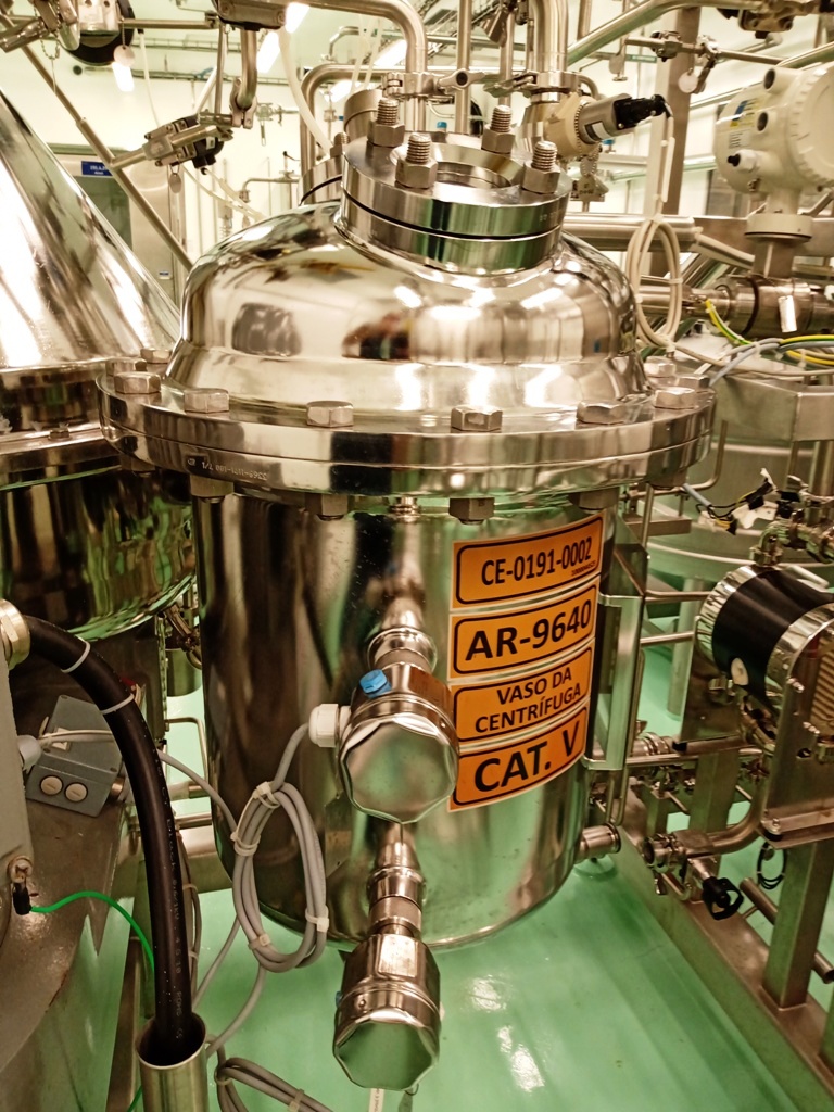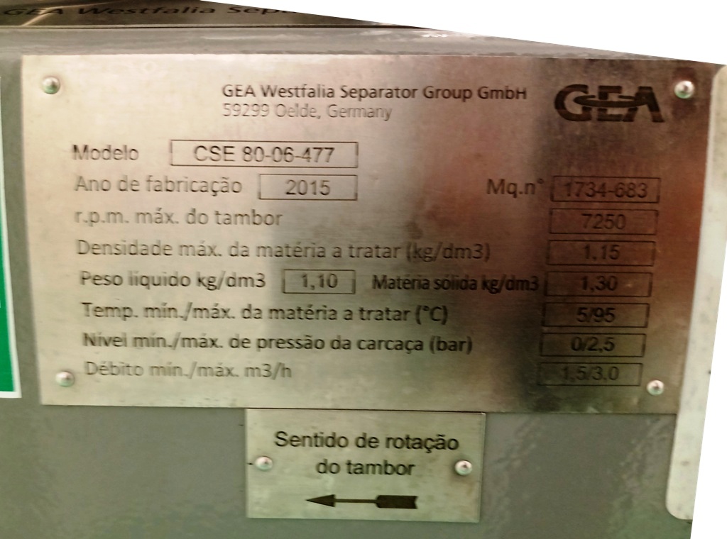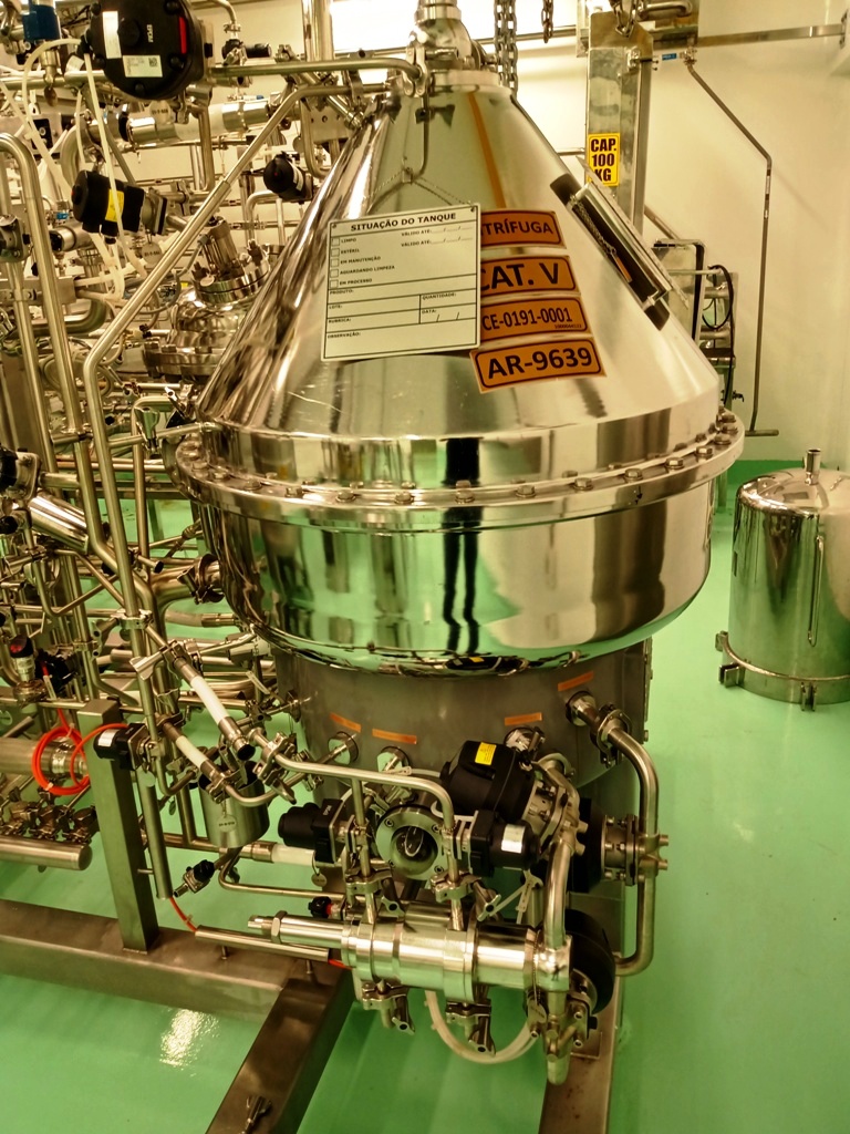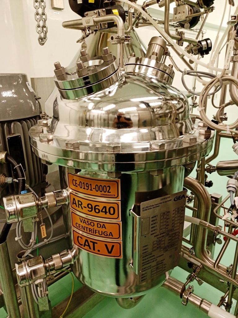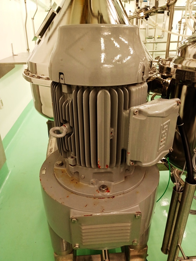 Max bowl speed 7250 RPM, rated @ 1500-3000 LPH, solids capacity 10L, bowl volume 20L. Steam sterilizable (SIP up to 2.5 bar @ 137C) FDA/USP class 4 seals, fully CIP, hydrohermetic feed system, 18.5 KW motor 460/3/60/1750 RPM with VFD, feed pump, all valves and piping, vibration monitor, tools and control panel unitized on a portable skid. 2015 vintage. Excellent condition. FCA Brazil.
