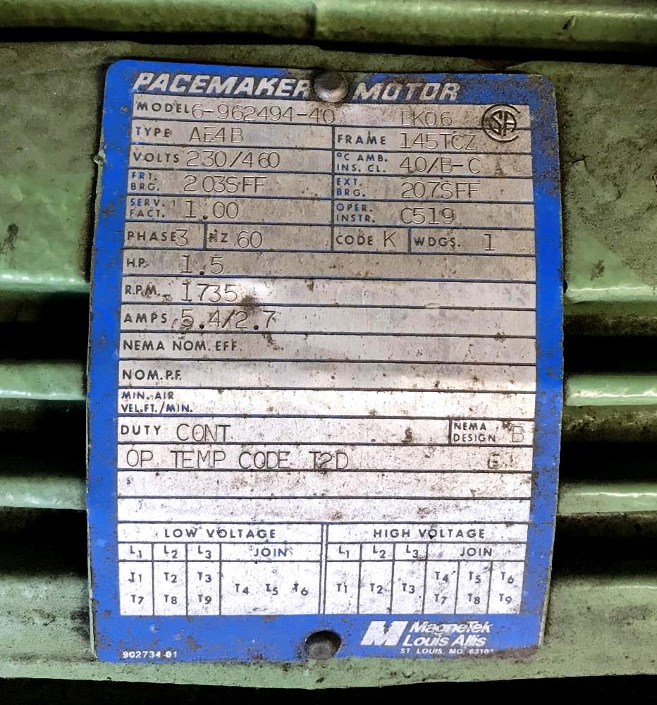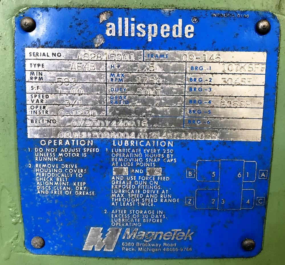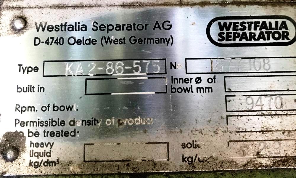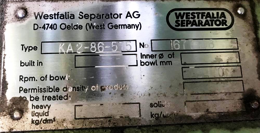 Max bowl speed 9470 RPM, rated @ 1000 GPM, 2 chambers. 1.5 HP motor 230/460/3/60/1735 RPM and control panel. No tools. Very good condition.