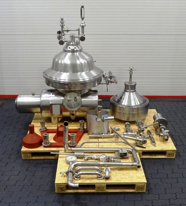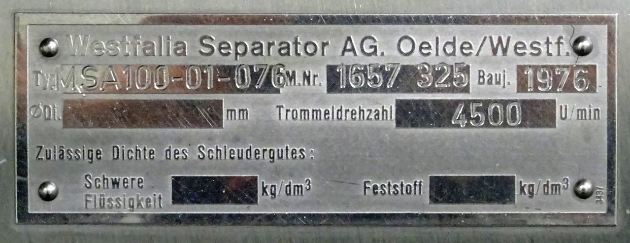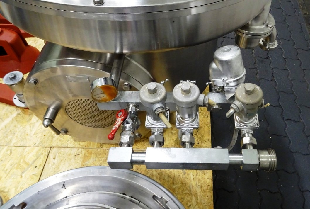 The Westfalia MSA 100-01-076 milk separator, 316SS. is engineered for high-efficiency performance in the dairy industry, making it an essential asset for any milk processing facility. With a maximum bowl speed of 4500 RPM, this separator is capable of skimming up to 15,000 liters per hour, ensuring rapid and effective separation of cream from milk. The robust 22 KW motor, operating at 380V, 3-phase, and 50 Hz, provides reliable power and performance, while the fluid clutch system enhances operational efficiency by allowing for smooth starts and stops. The inclusion of a pressure meter on the outlet and a counter pressure valve ensures precise control over the separation process, allowing operators to maintain optimal conditions for cream extraction and milk processing.