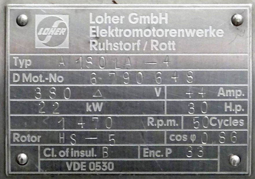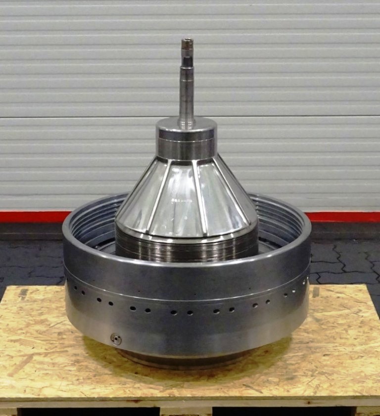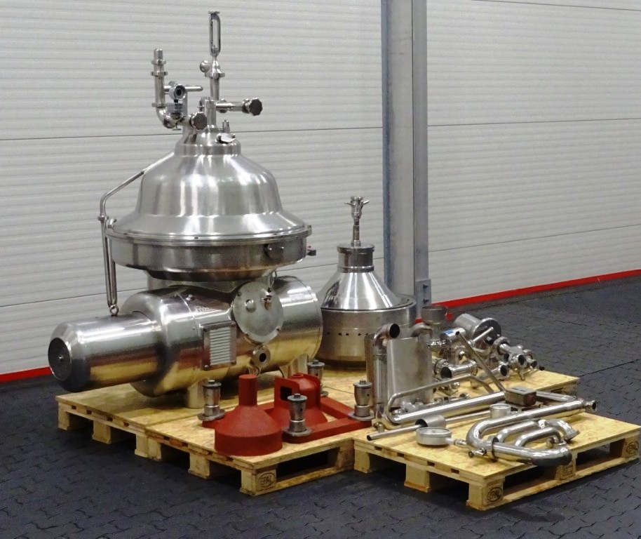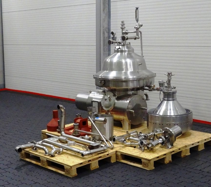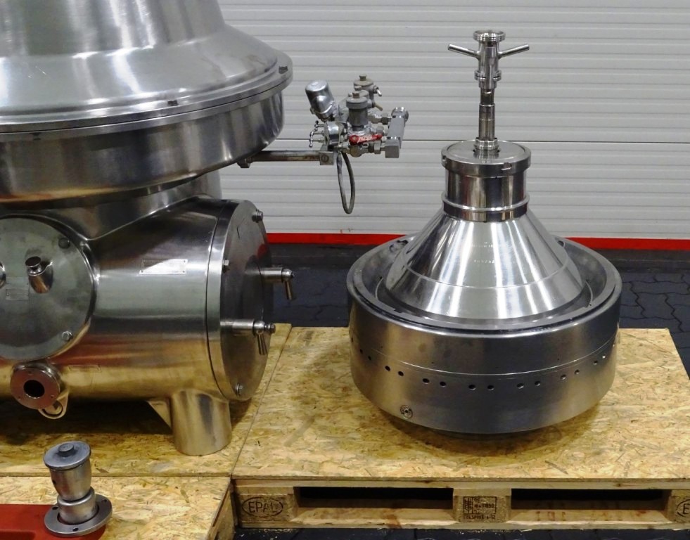 Max bowl speed 4500 RPM, rated @ 15,000 LPH on skimming. 22 KW motor 380/3/50/1460 RPM with fluid clutch, pressure meter on outlet and counter pressure valve, manual flow regulation valve for cream, maneuvering water valves, piping, base frame and tools. 1976 vintage. Very good condition. Located in Europe.