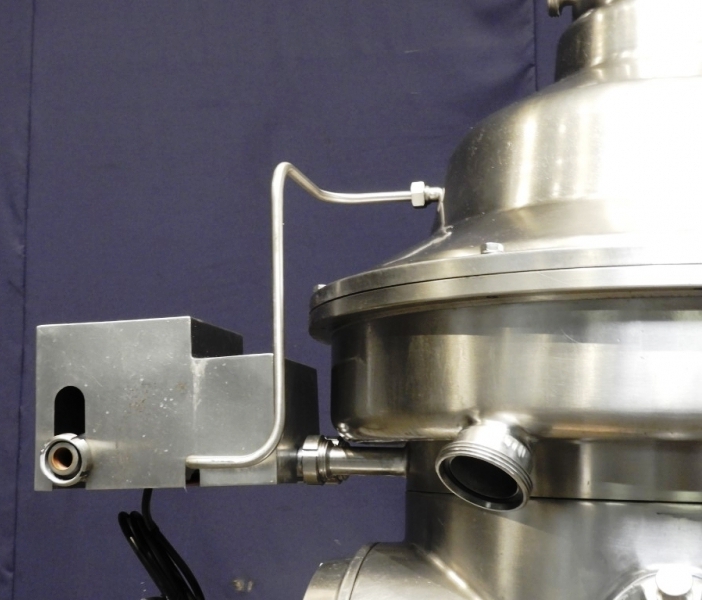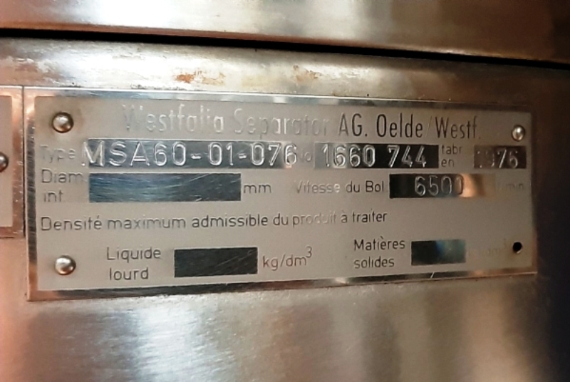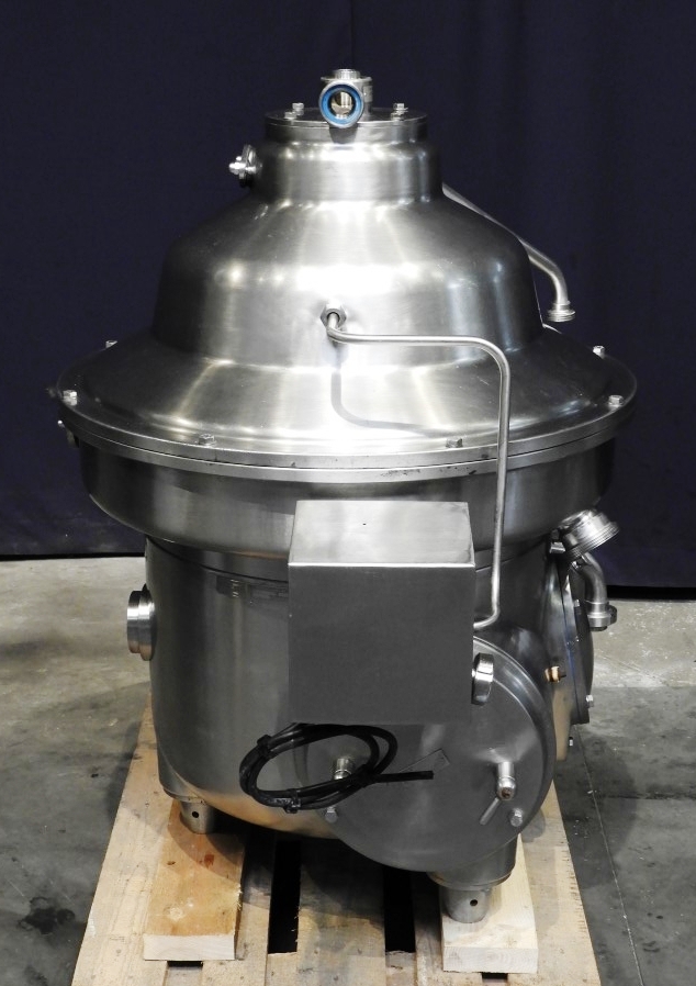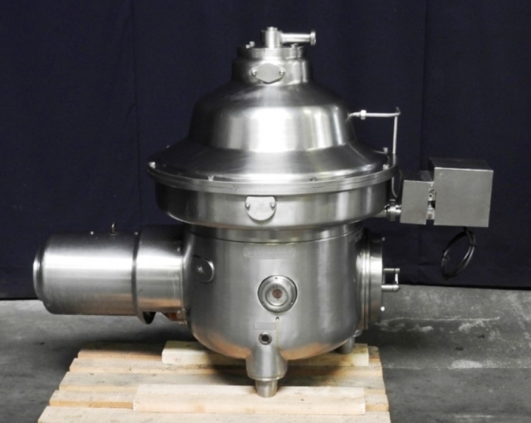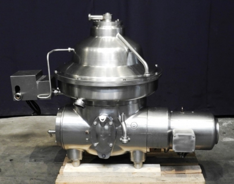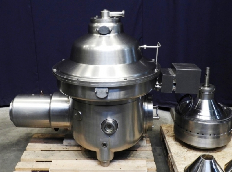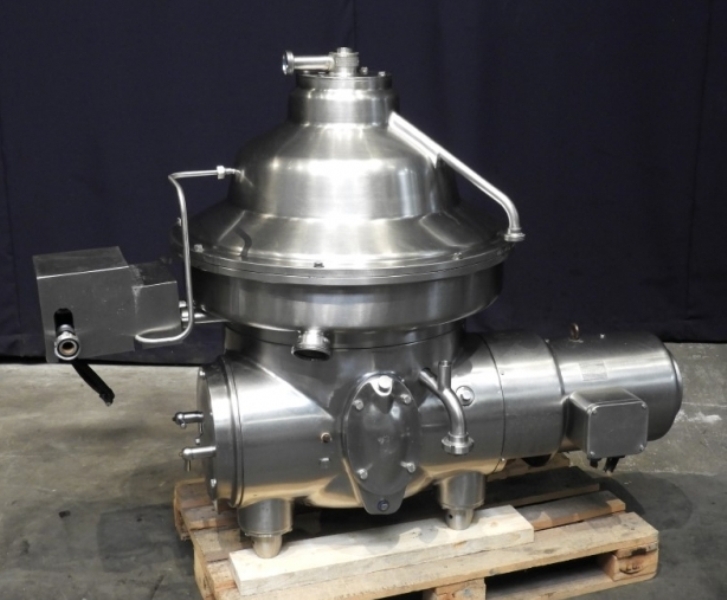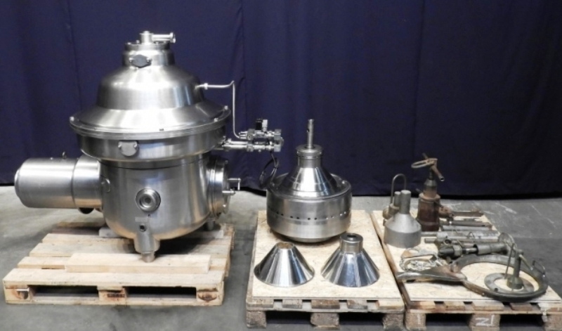 Bowl speed 6450 RPM, rated @ 10,000 LPH milk standardization/cleaning/whey skimming, 7000 LPH milk skimming, 17 KW motor 380/3/50/1445 RPM, base plate, tools and water valves. 1976 vintage. Excellent condition. FCA Europe.