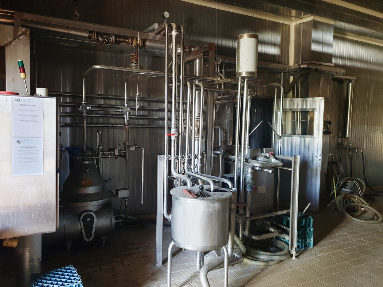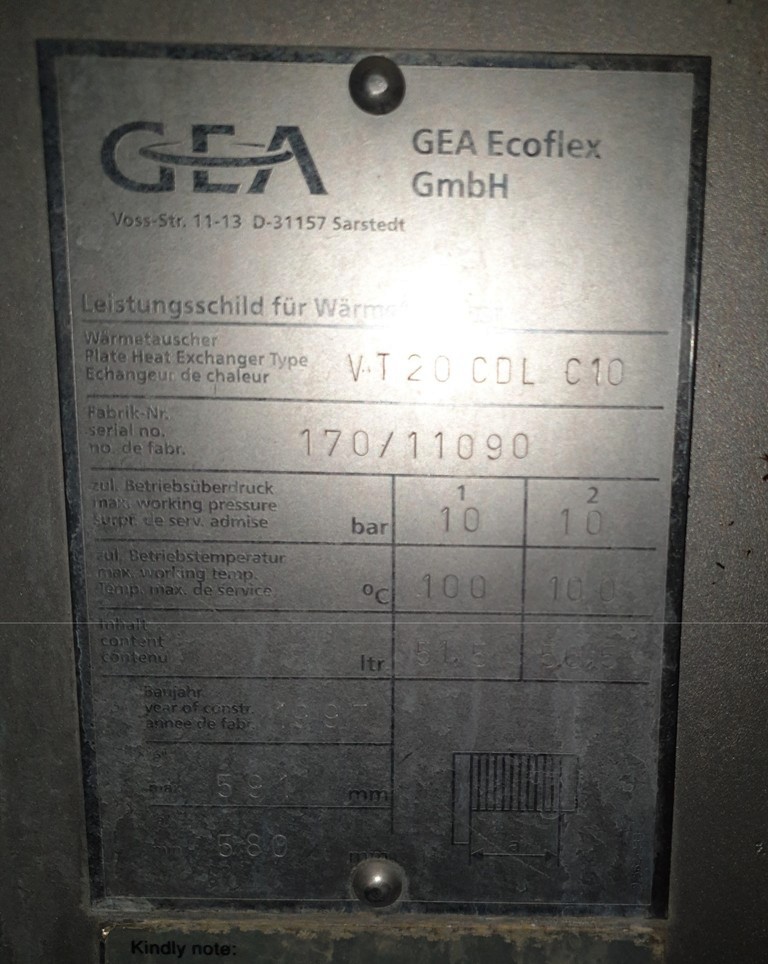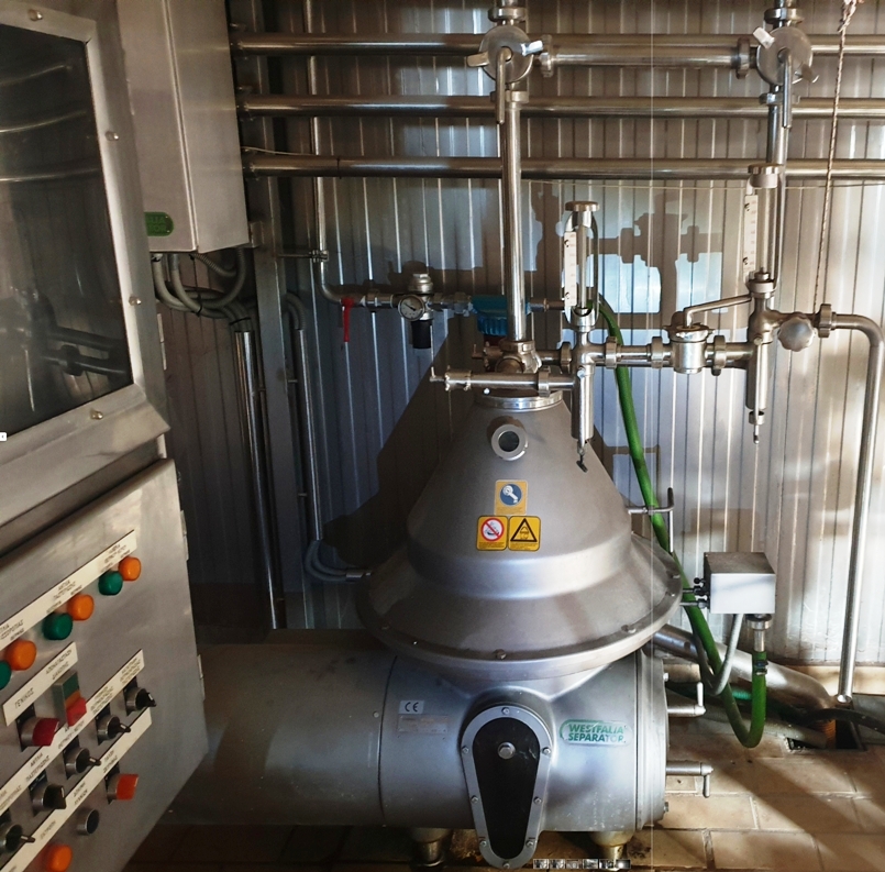 Max bowl speed 6200 RPM, milk skimming cap. 5000 LPH. 7.5 KW motor 420/3/50, sludge tank, pump, tools, crane, Ecoflex VT20 CDL-C10 plate heat exchanger for milk and cream pasteurization, all interconnecting piping, valves, gauges and controls. 1998 vintage. Excellent condition. FCA Europe.
