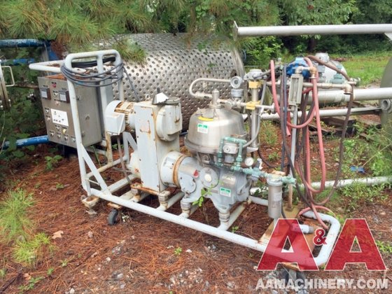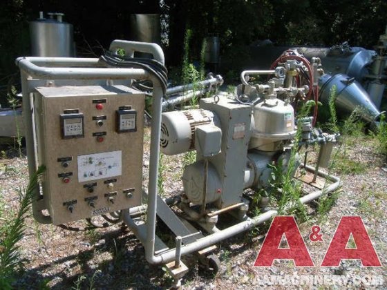 Max bowl speed 8510 RPM, rated @ 5000 LPH. Combination desludger/nozzle bowl, liquid discharged under pressure. 7.5 HP motor 230/460/3/60/1800 RPM with piping, valves, gauges, turbidity meter, timing unit and tools. Unitized on a portable cart. 1986 vintage. Very good condition.