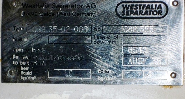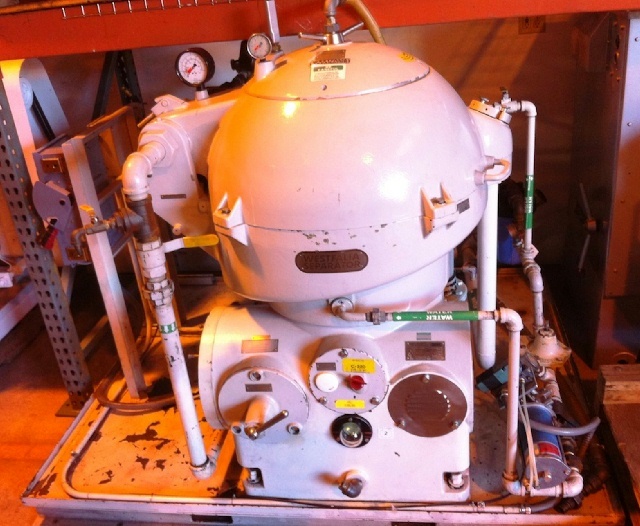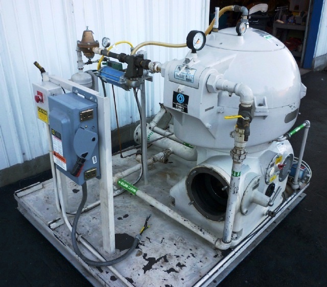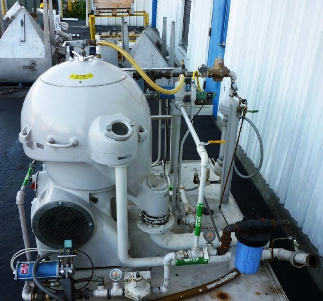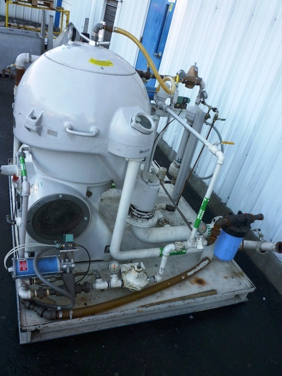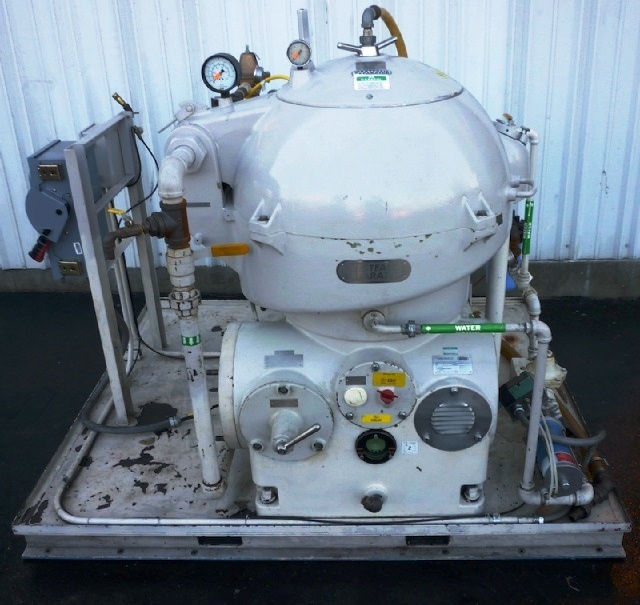 Max bowl speed 6510 RPM, rated @ 12300 LPH, oil discharge under pressure, feed pump, water harness, tools, spare parts and controls. Unitized on a sub-base. Excellent condition. ***Missing 20 HP motor***