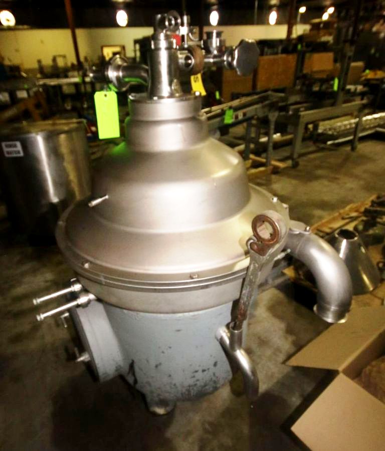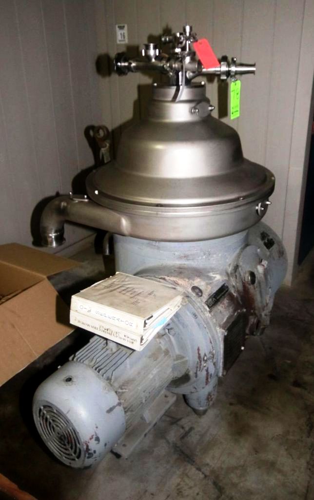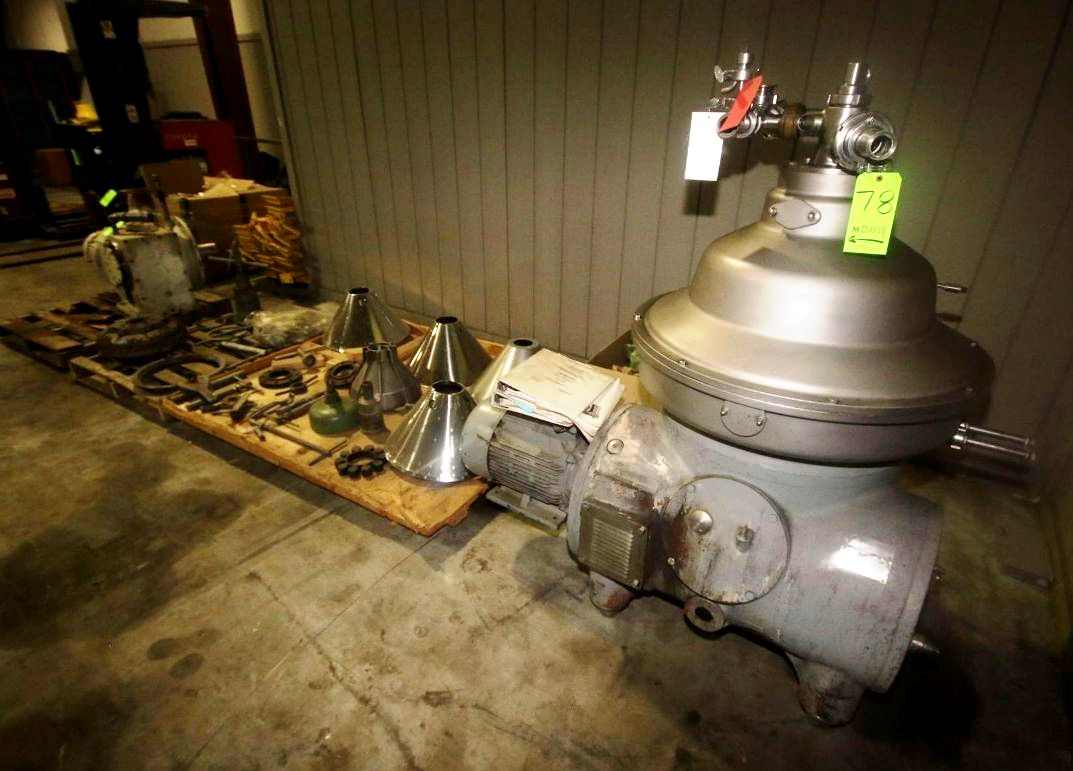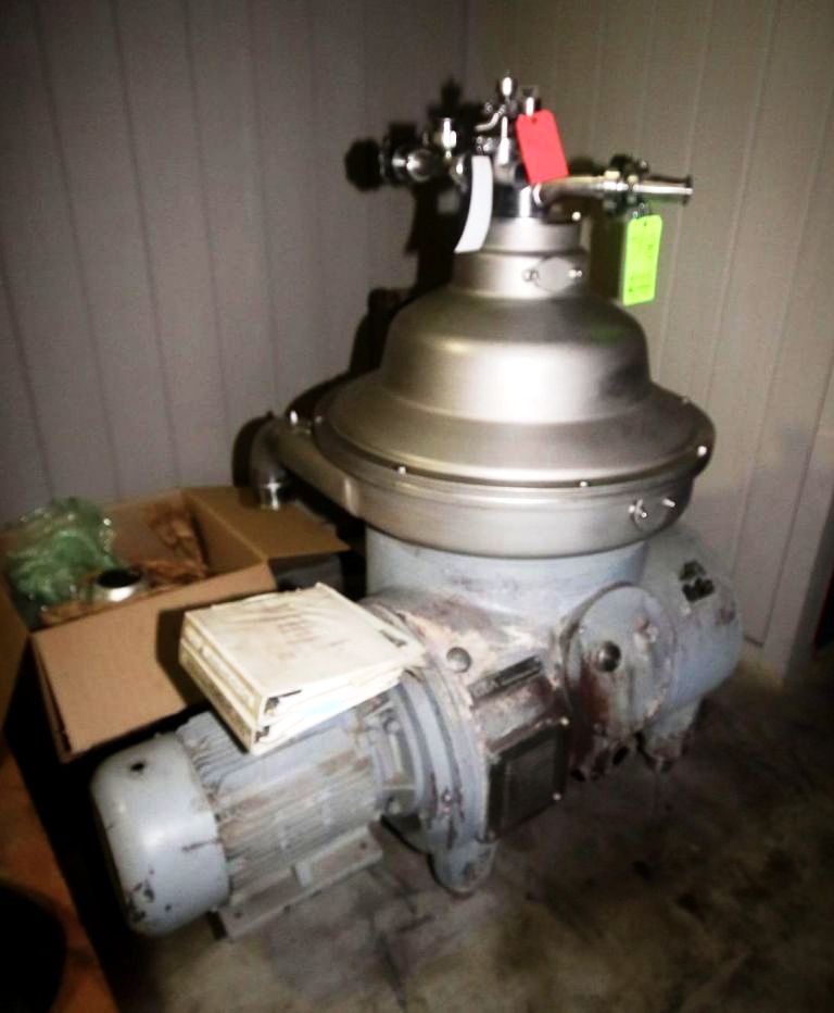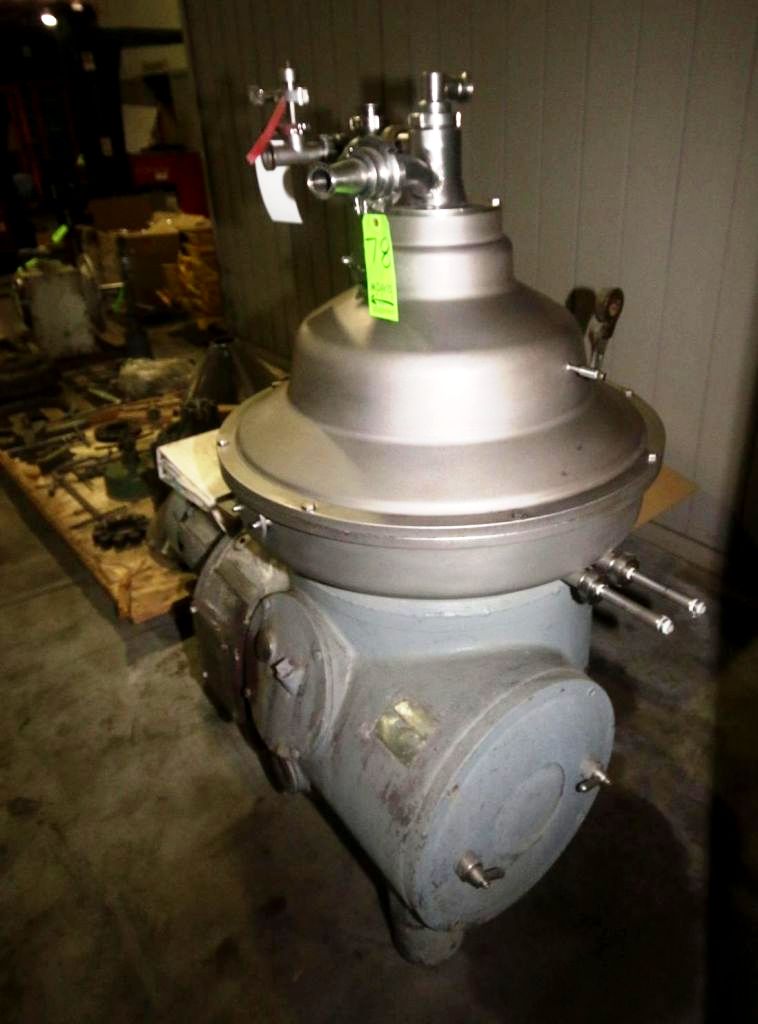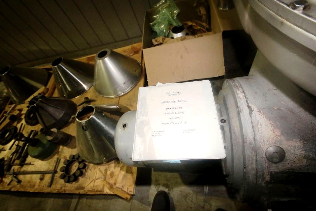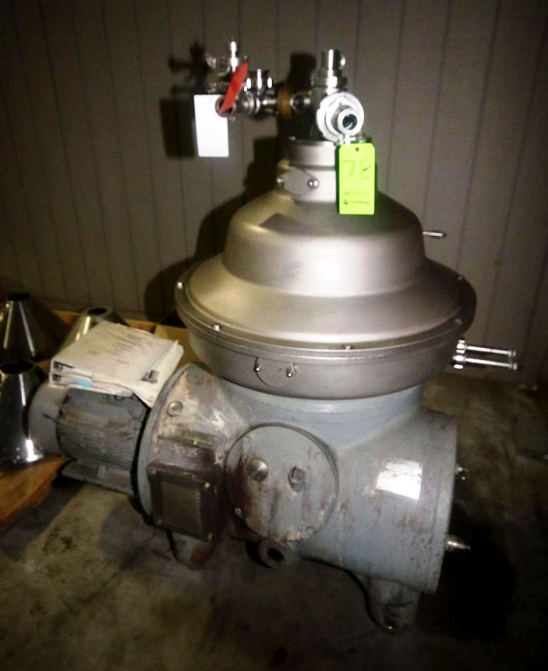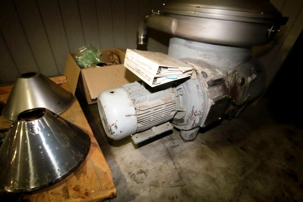 Max bowl speed 6450 RPM, rated @ 13000 LPH, both liquid phases discharged under pressure, 20 HP motor 230/460/3/60/1760 RPM, tools and spare parts. Very good condition.