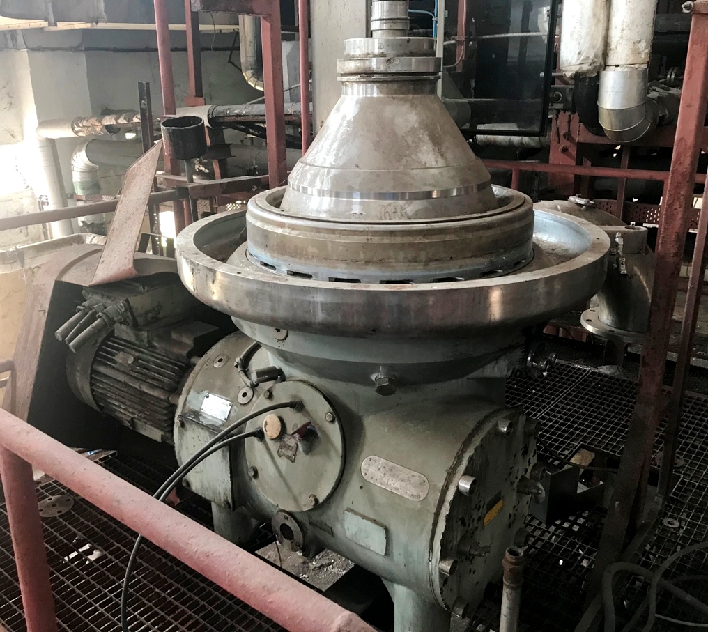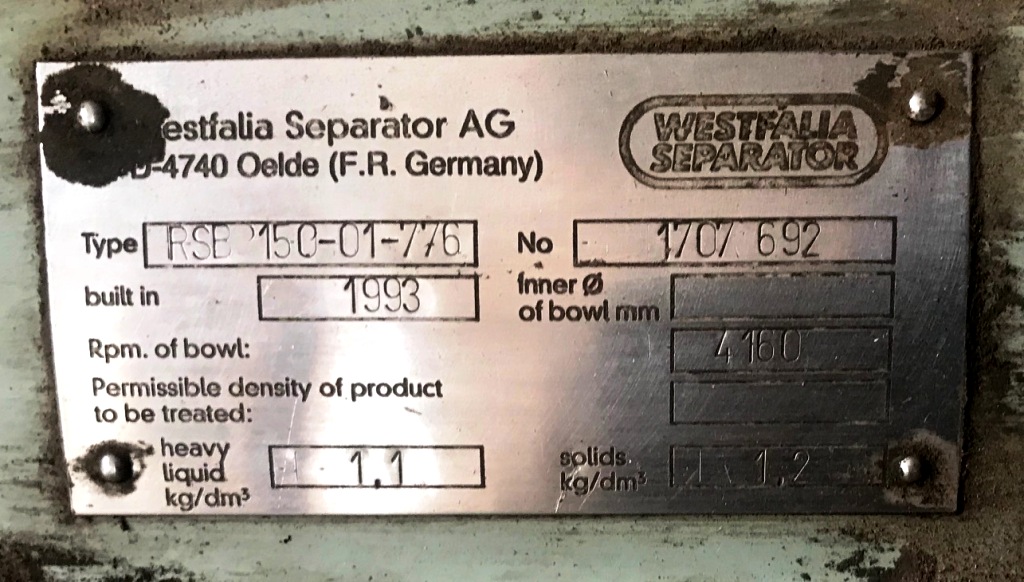 Max bowl speed 4700 RPM, rated @ 40,000 PPH, both liquid phases discharged under pressure, 60 HP motor 460/3/60/1760 RPM. No tools or control panel. MISSING TOP COVER. 1993 vintage. Very good condition. FCA India.