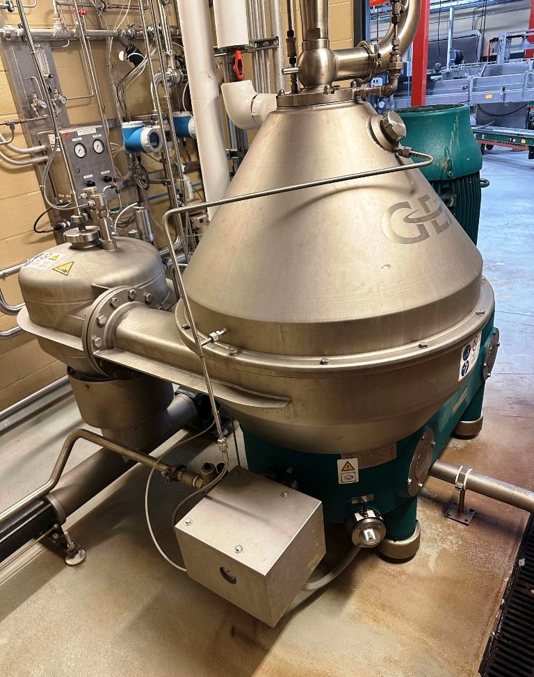 Max bowl speed 6500 RPM, rated @ 120 TPD degumming, liquid phases discharged under pressure, 15 KW XP motor 380/3/50/1450 RPM, manual counter pressure valve, tools and control panel. Excellent condition. FCA Europe.