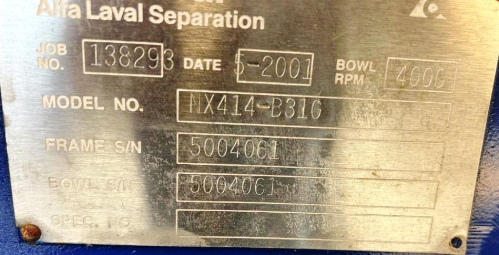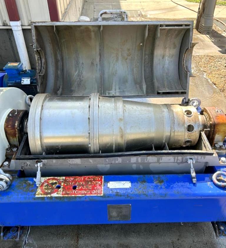 (2) Alfa-Laval NX 414B-31G decanter centrifuges, 316SS. are engineered for high-efficiency separation processes, making them ideal for a variety of industrial applications. With a maximum bowl speed of 4000 RPM and generating forces up to 3150 x G, these centrifuges are capable of effectively separating solids from liquids with precision and reliability. The 70mm single lead hardsurfaced conveyor ensures optimal performance, reducing wear and tear while enhancing the longevity of the equipment. The robust 25 HP motor, operating at 460V, 3-phase, 60 Hz, and 1760 RPM, provides the necessary power to handle demanding separation tasks, ensuring consistent throughput and operational efficiency. The included 159:1 2.5 kMn gearbox further enhances the performance, allowing for smooth operation and effective torque transmission, which is critical in high-speed applications.