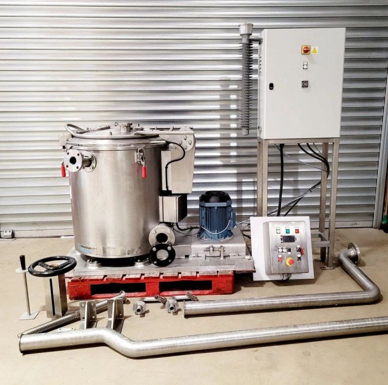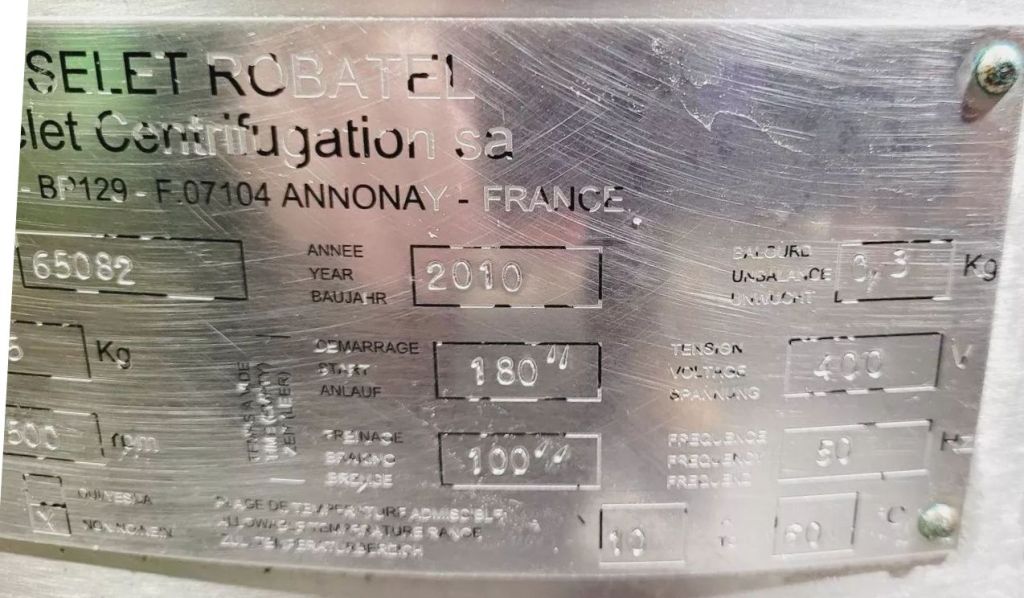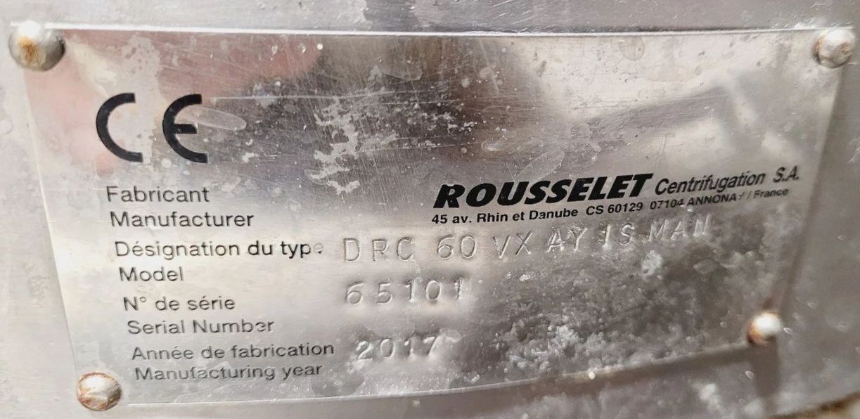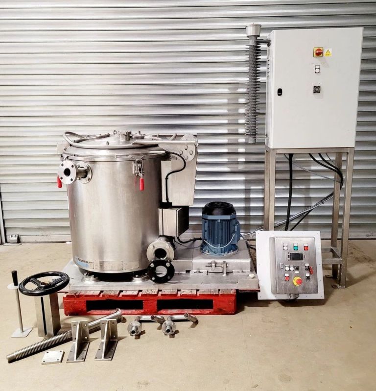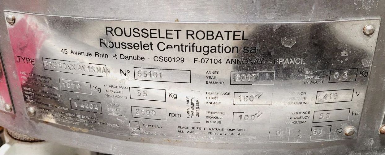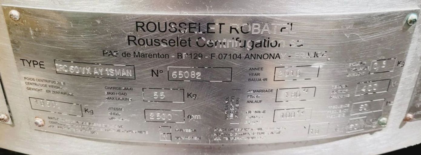 Max bowl speed 2500 RPM, 2095 x G, 350 x 500mm (23.6 x 13.8") ID solid bowl, top unload. 60 L volume, 27 L cake capacity, max load 55 kg, rated @ 65 LPH (17.1 GPM). 9.2 KW motor 400/460/3/50/60, hinged top cover opened with electric motor, sight glass, feed pipe, liquid skimmer/siphon, mounted on inertia base with control panels. 2010 and 2017 vintage. Excellent condition. Located in UK.