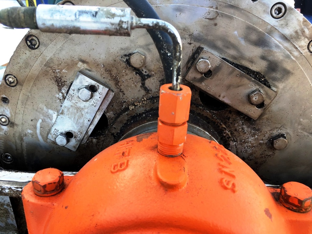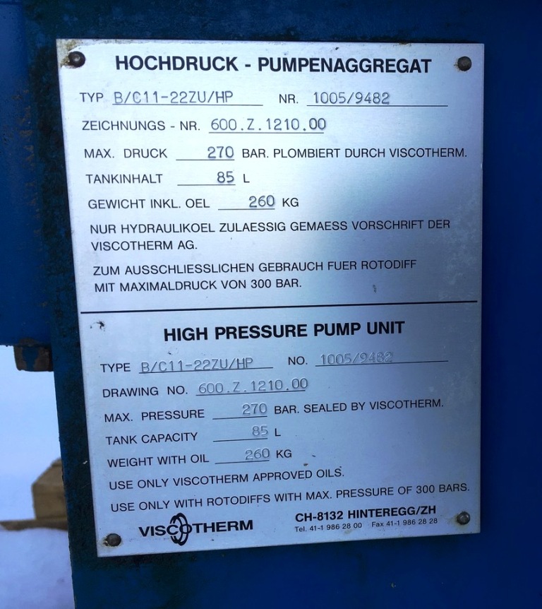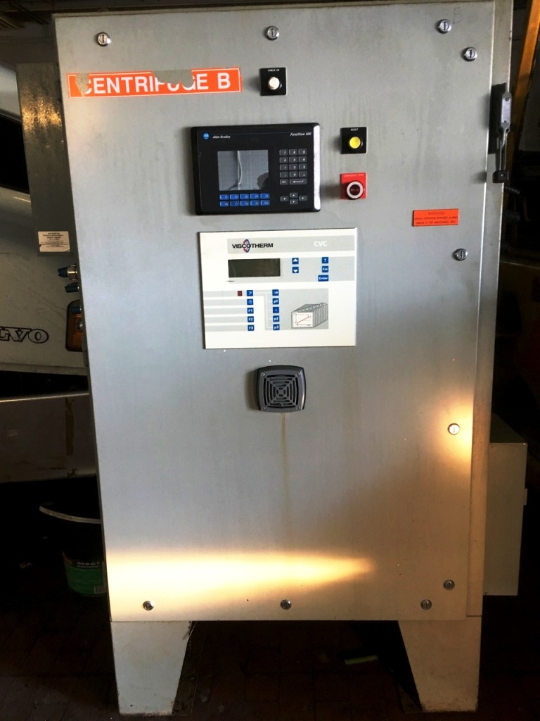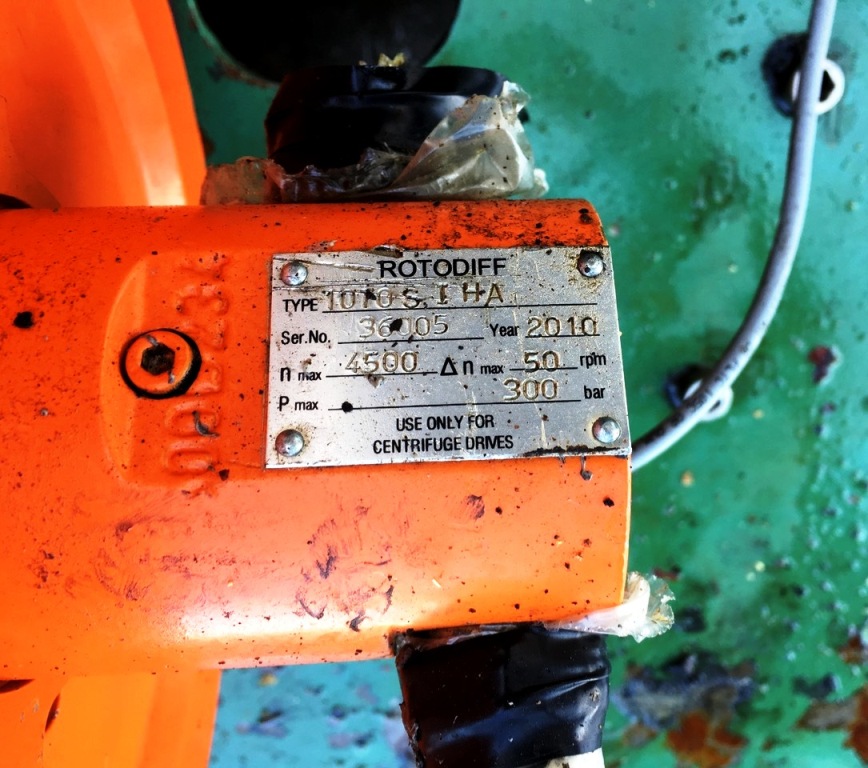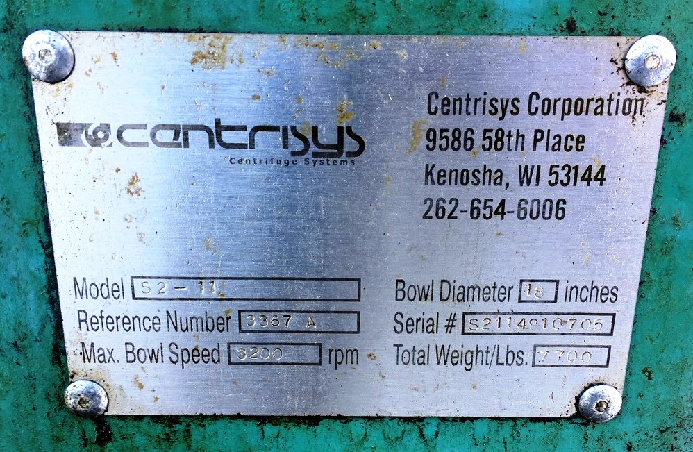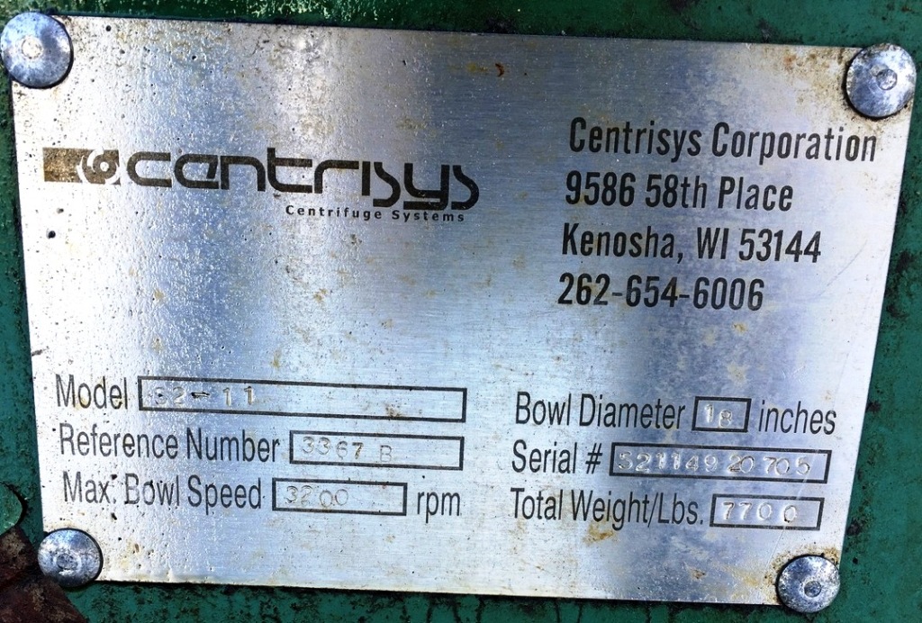 Max bowl speed 3200 RPM, 2616 x G, 18 x 72" bowl ID, 10 degree beach, 6" single lead hardsurfaced conveyor, 40 HP 208-230/460/3/60 main drive, 15 HP 208-230/460/3/60 hydraulic Viscotherm back drive with 1070 SIHA Rotodiff, NEMA 4 Control panel with Allen-Bradley PowerFlex 700 VFD for main drive, feed tube and guard. Prior use: Ethanol. Very good condition. Located in Canada. Exclusive.