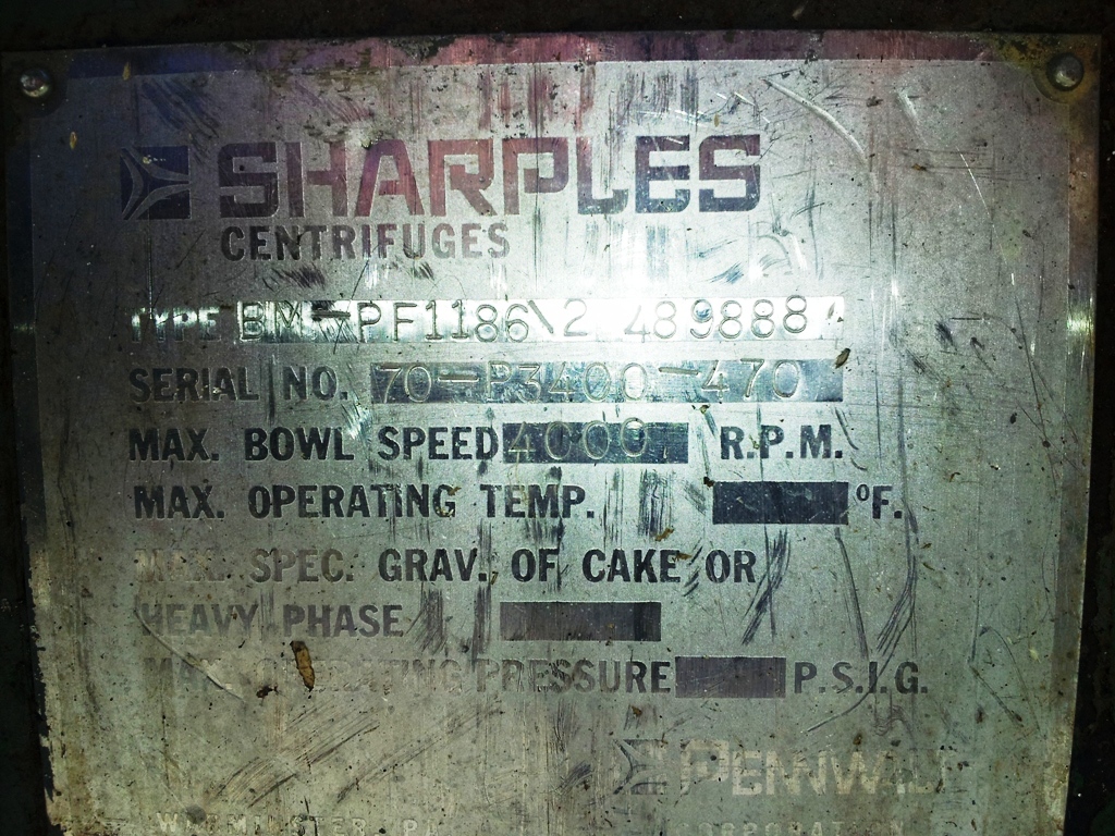 The (2) Sharples P3400 decanter centrifuges, 316SS, are engineered for high-performance separation processes, making them an invaluable asset for various industrial applications. With a maximum bowl speed of 4000 RPM, these centrifuges are designed to efficiently separate solids from liquids, ensuring optimal performance in distillation processes. The hogged-out cake ports and grooved beach design contribute to enhanced cake discharge and improved separation efficiency, allowing for a more streamlined operation. The robust 3" single lead hardsurfaced conveyor is built to withstand the rigors of continuous operation, ensuring longevity and reliability in demanding environments. Powered by a formidable 40 HP motor operating at 460V/3/60, these centrifuges are capable of handling substantial workloads while maintaining energy efficiency, making them a cost-effective solution for your separation needs.