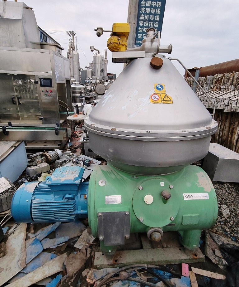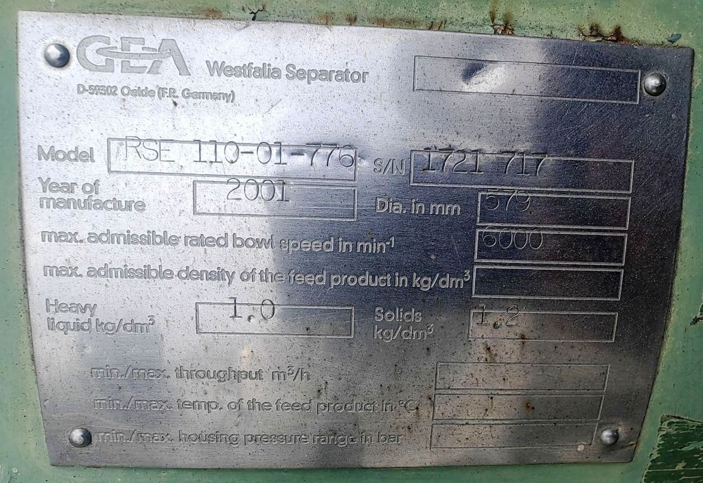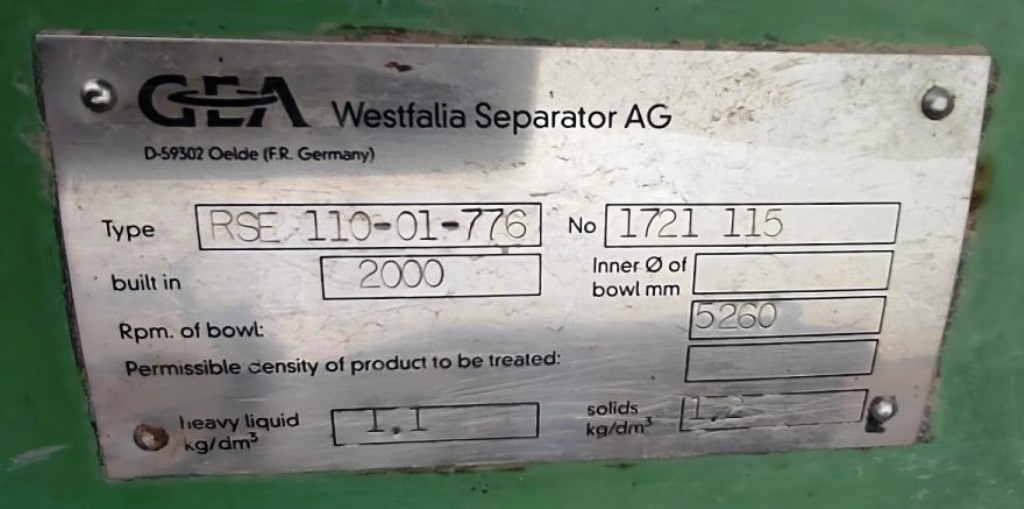 (2) Westfalia RSE 110-01-776 vegetable oil separators, 316SS. are engineered for high-efficiency separation of vegetable oils, making them an ideal choice for industries that require reliable and effective processing solutions. With a maximum bowl speed of 5260 RPM and a centrifugal force of 8950 x G, these separators are capable of handling large volumes of liquid with a rated capacity of 30,000 liters per hour (LPH). The design ensures that both liquid phases are discharged under pressure, optimizing the separation process and minimizing downtime. The robust 30 KW motor operates at 380V, 3-phase, 50 Hz, with a speed of 1460 RPM, ensuring consistent performance even in demanding operational environments. These separators are vintage models from 2000 and 2001, yet they remain in very good condition, demonstrating the durability and longevity of Westfalia's engineering excellence.