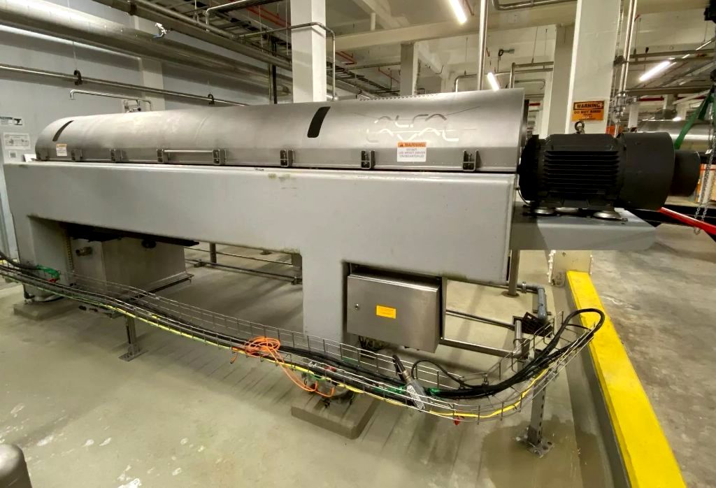 The (3) Alfa-Laval FOODEC 610 sanitary decanter centrifuges, 316SS. represent a pinnacle of engineering designed for high-efficiency separation in various industrial applications, particularly in the food and beverage sector. With a maximum bowl speed of 3075 RPM and a centrifugal force of 3040 x G, these centrifuges are optimized for rapid and effective separation of solids from liquids. The 10-degree beach angle enhances the separation process, ensuring that the solids are efficiently discharged at a 360-degree angle. This design allows for a continuous operation, making it ideal for high-volume processing environments such as breweries, where consistent quality and throughput are paramount. The liquid discharge is facilitated under pressure through a paring disc and skimmer tube, ensuring that the liquid phase is removed effectively while minimizing the risk of contamination, which is critical in sanitary applications.