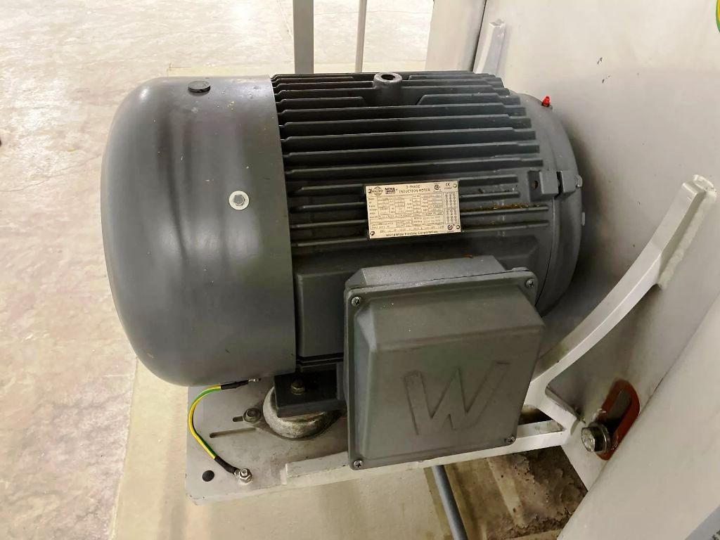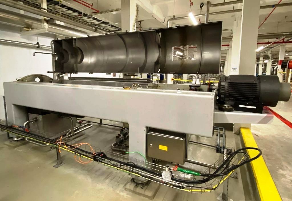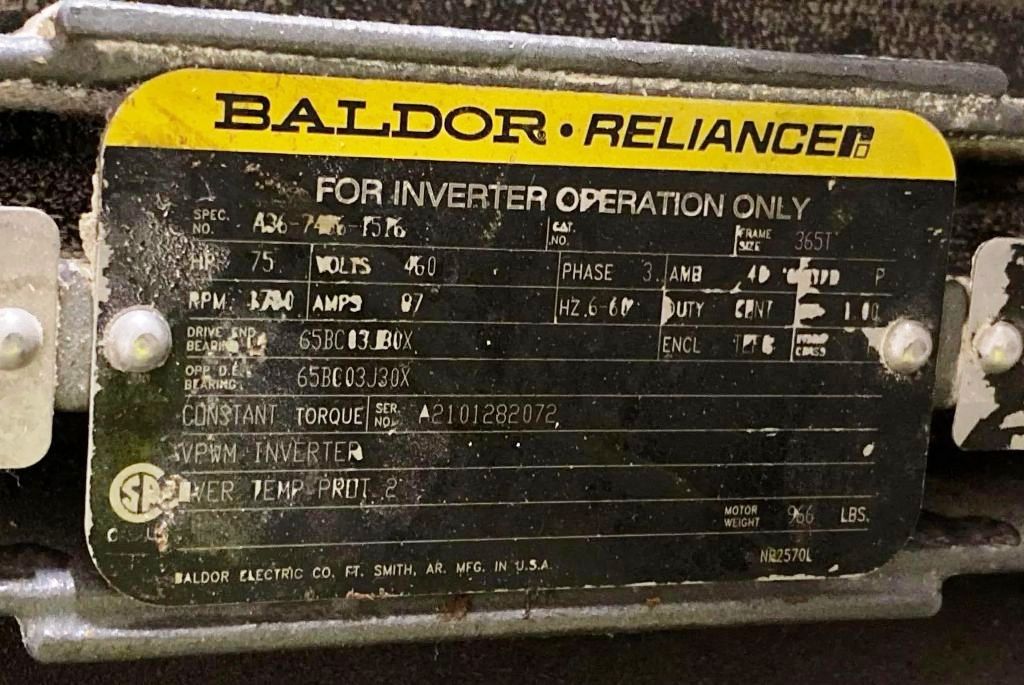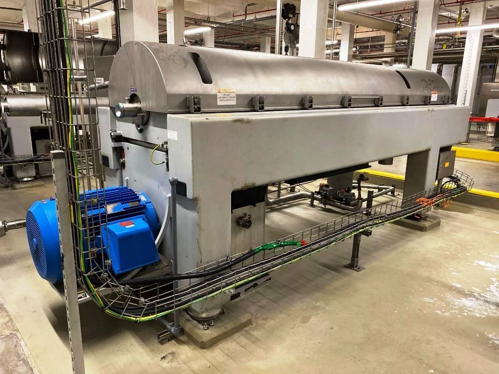 Max bowl speed 3075 RPM, 3040 x G, 575 x 2565mm (22.6 x 101") bowl ID. 10 degree beach angle, 360 degree cake discharge, liquid discharged under pressure via paring disc thru skimmer tube, 7.5" single lead hardsurfaced conveyor, 75 HP motor 460/3/60/1780 RPM, 102:1 12 kNm DD gearbox, 30 HP backdrive, guards, CIP bar, feed tube, vibration switch/isolators and chutes, mounted on 4' stand. 2021 vintage. Prior use: Brewery. Excellent condition.