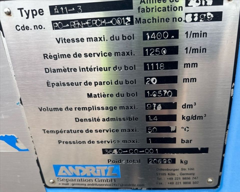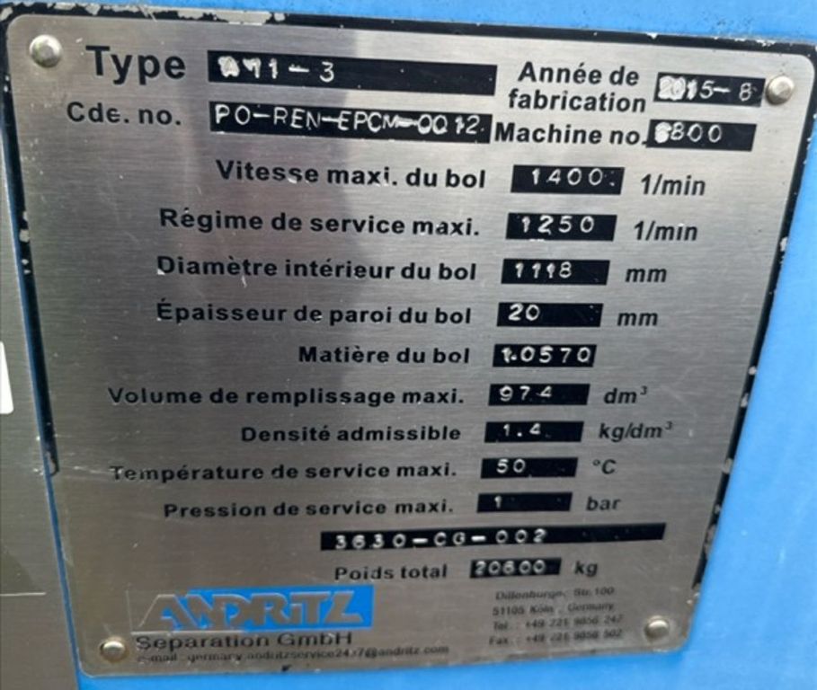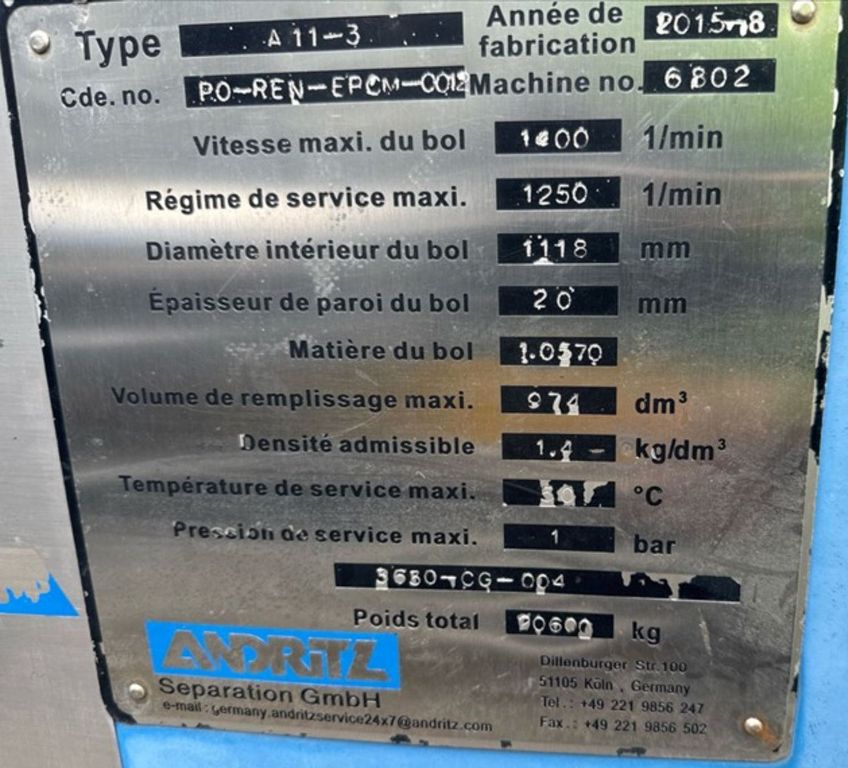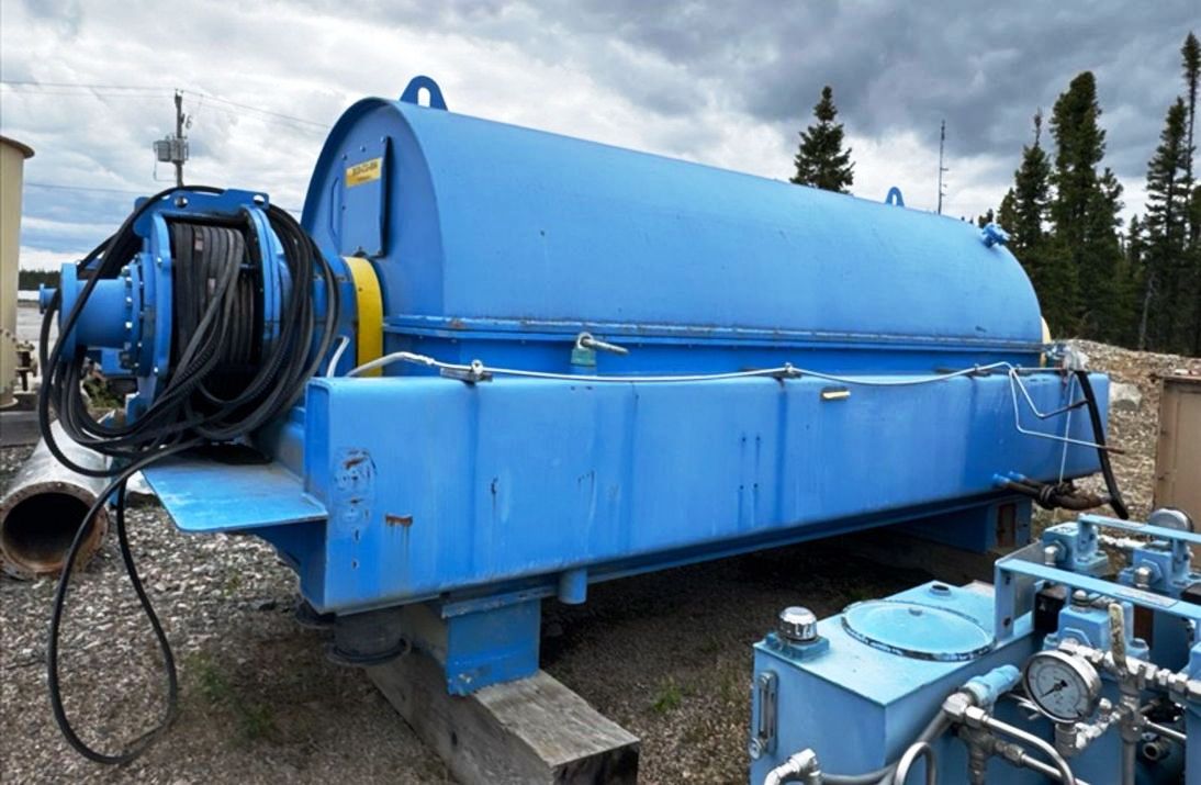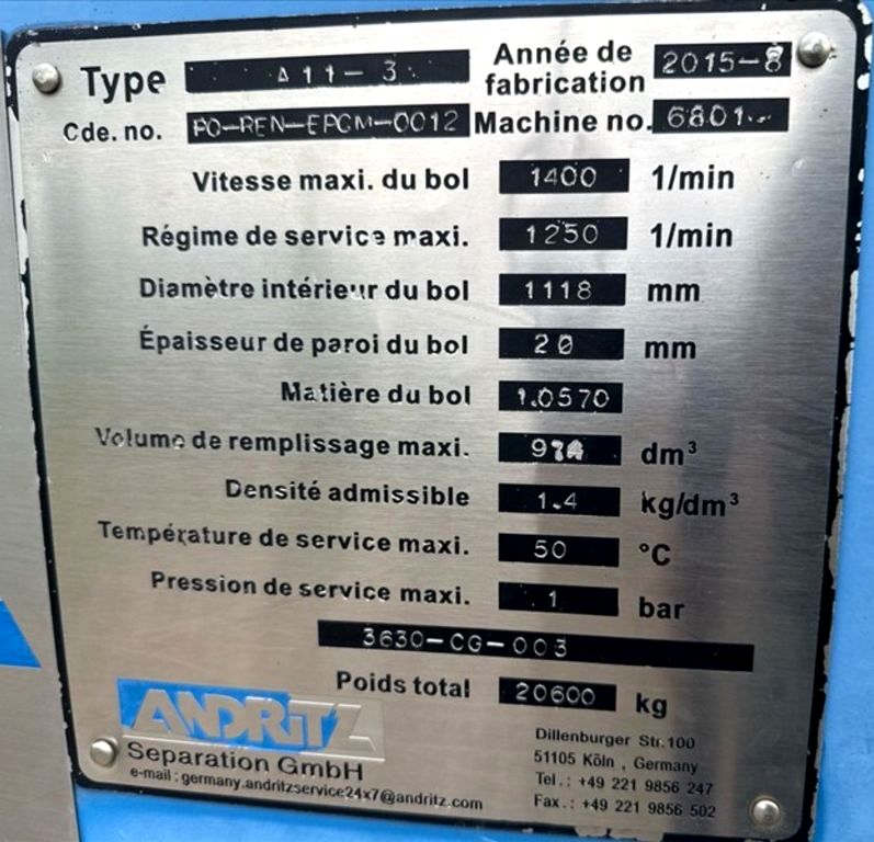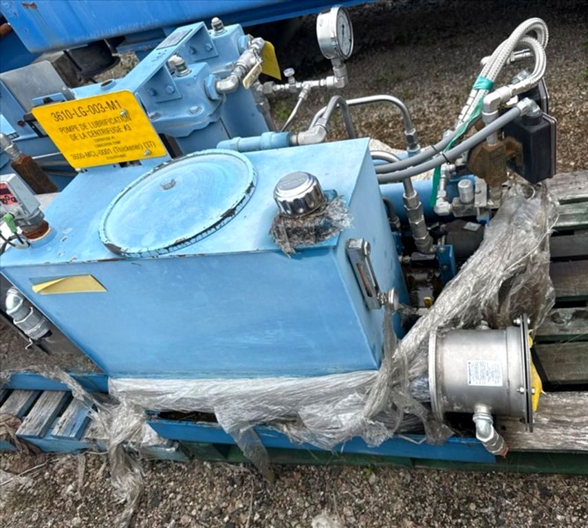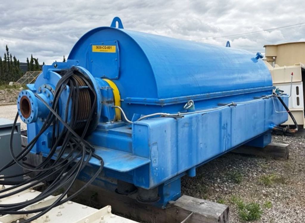 Max bowl speed 1400 RPM, 1235 x G, 8 degree beach angle, 14" double lead ceramic-tiled conveyor and feed zone, 400 HP motor 575/3/60/1180 RPM, SA-57 39:1 gearbox, limit switch, lube system, feed tube and guards. Excellent condition. Located in Canada.