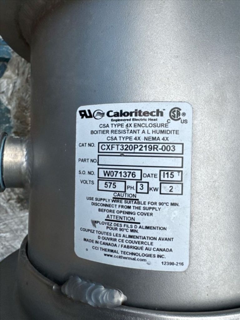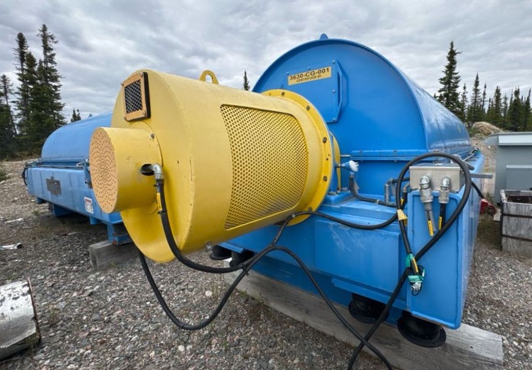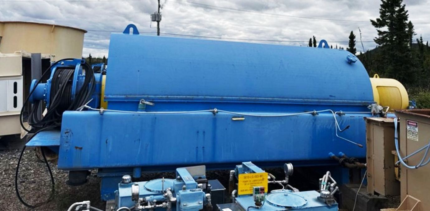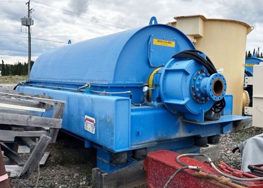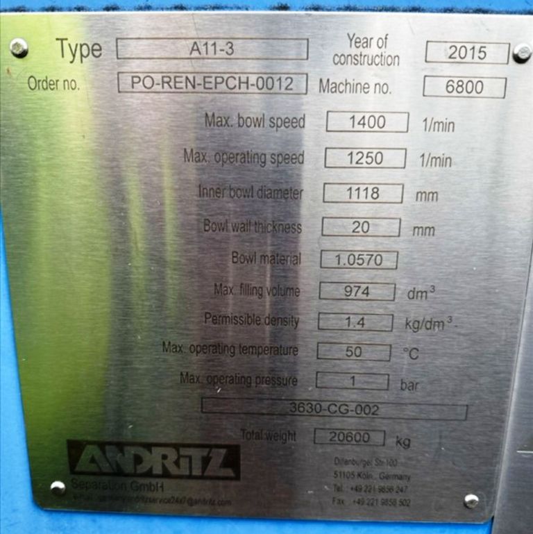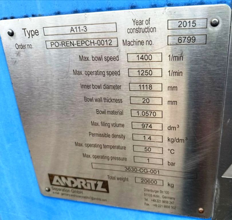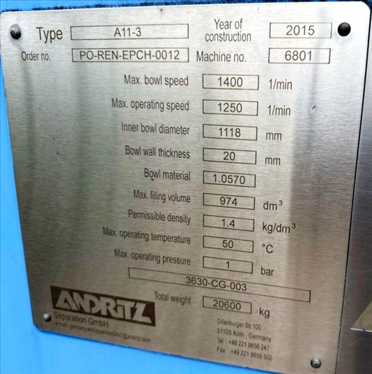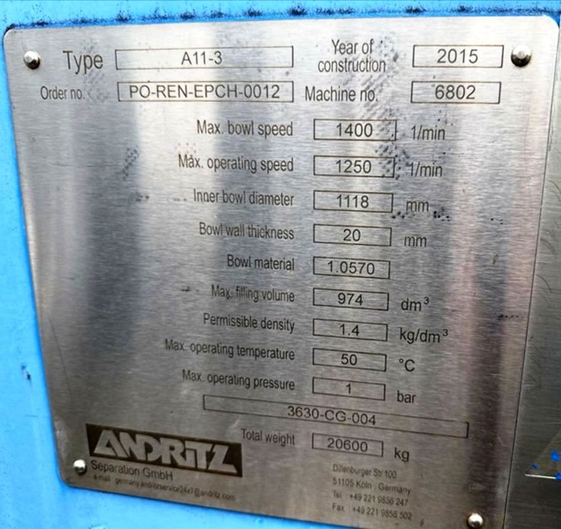 Max bowl speed 1400 RPM, 1235 x G, 8 degree beach angle, 14" double lead ceramic-tiled conveyor and feed zone, 400 HP motor 575/3/60/1180 RPM, SA-57 39:1 gearbox, limit switch, lube system, feed tube and guards. Excellent condition. Located in Canada.
