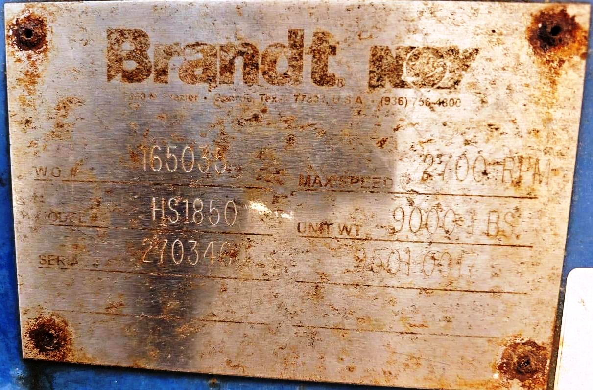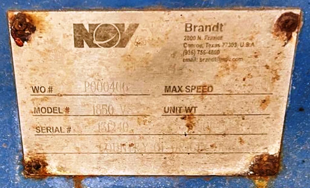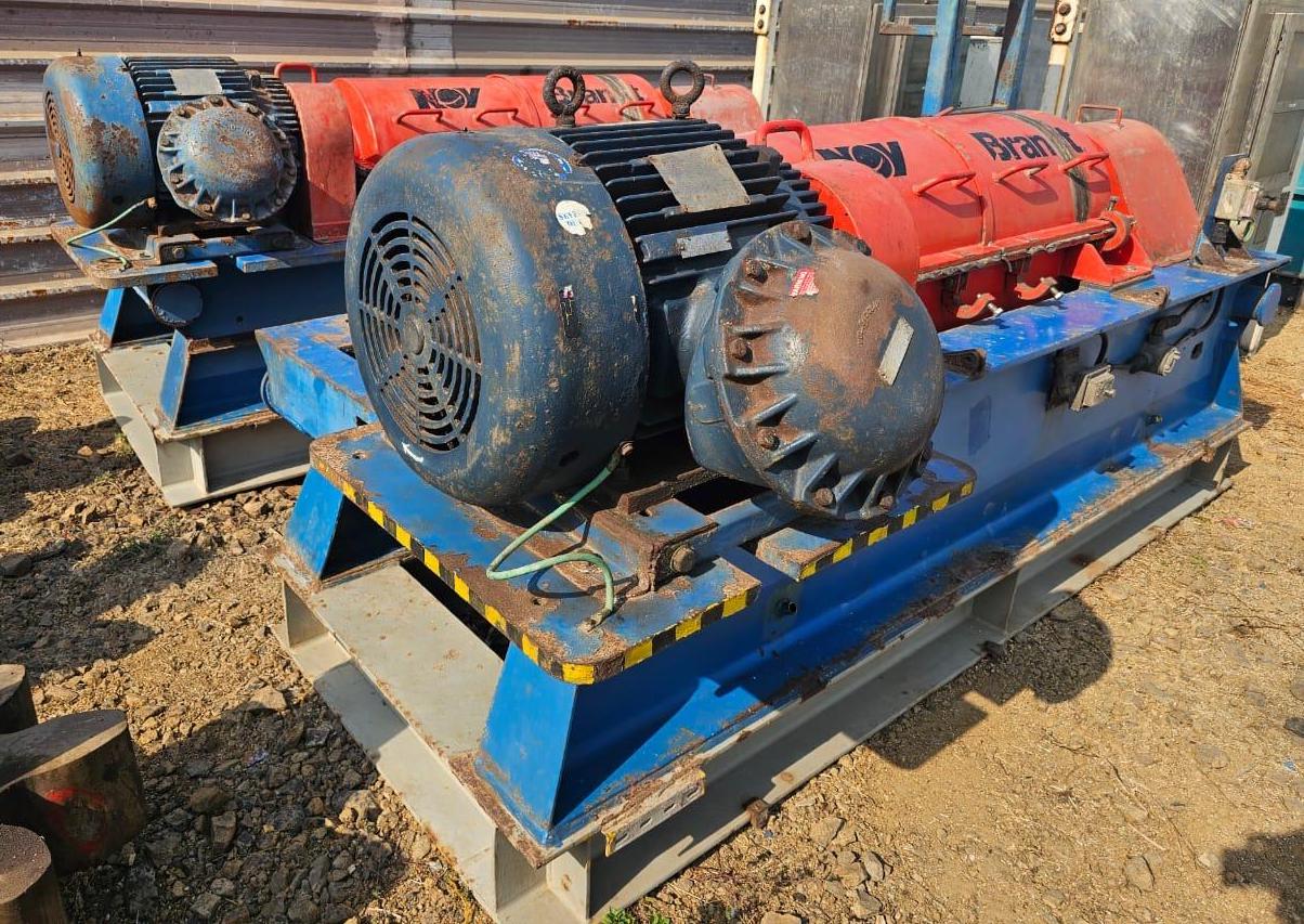 (4) NOV/Brandt HS-1850 oilfield decanter centrifuges, 316SS. are engineered to deliver exceptional performance in demanding oilfield applications. With a maximum bowl speed of 2700 RPM and a centrifugal force of 1862 x G, these centrifuges are designed to efficiently separate solids from liquids, ensuring optimal fluid clarity and quality. The 18" x 50" bowl ID provides a substantial processing capacity, making these units ideal for handling large volumes of drilling fluids. The robust 5" single lead STC-tiled conveyor enhances the separation process, ensuring that solids are effectively removed from the liquid phase. This high-performance design is complemented by a powerful 60 HP motor, capable of operating at 230/460/3/60/1775 RPM, which ensures reliable and consistent operation across various conditions. The SA-51 80:1 gearbox with TA assembly further enhances the performance and durability of the centrifuge, allowing for smooth operation and reduced wear on components.