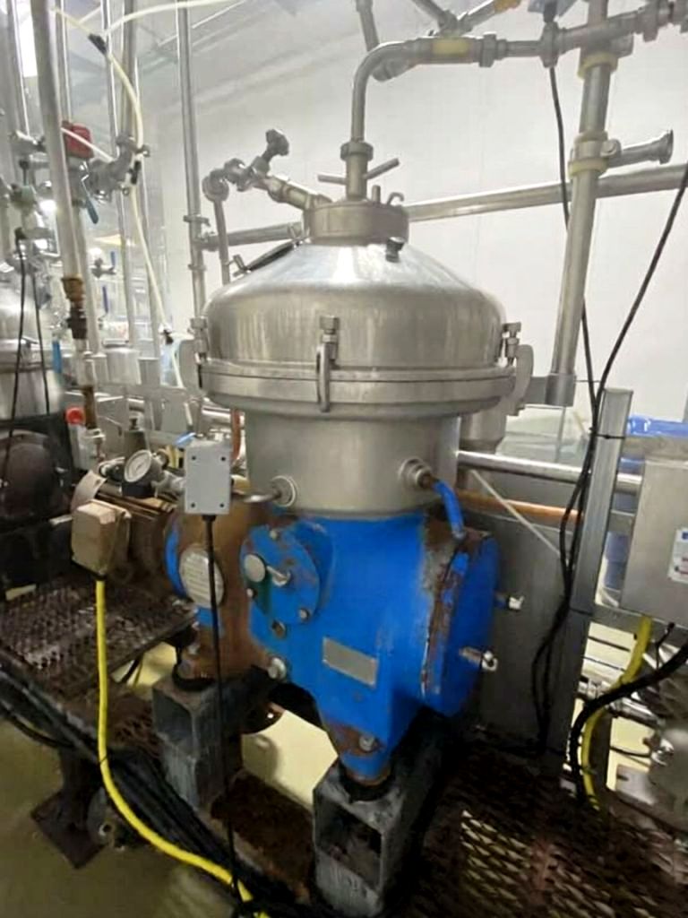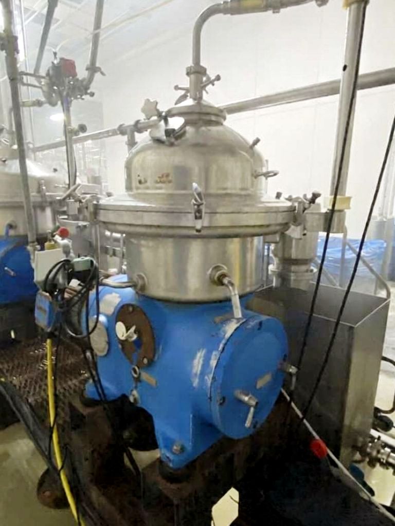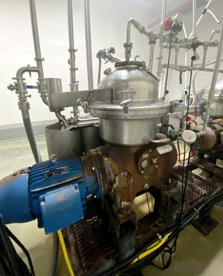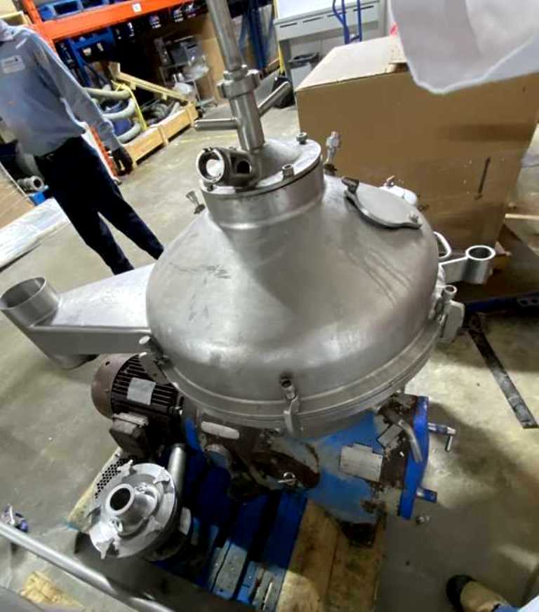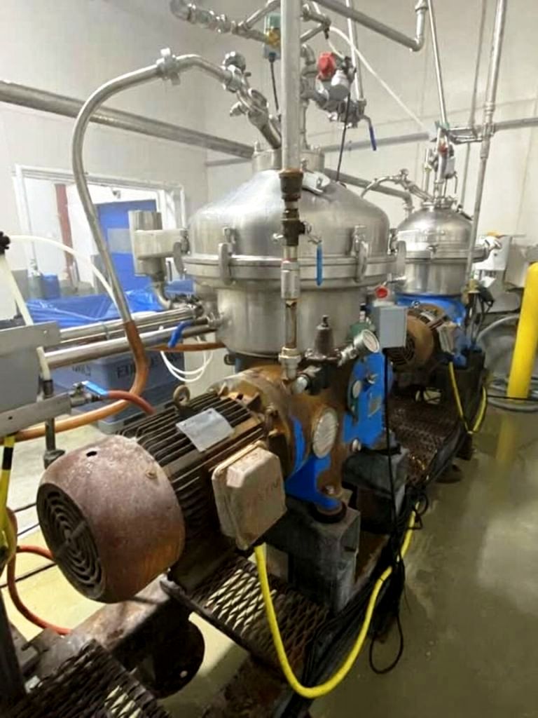 (4) Westfalia SA 20-03-076 separators, 316SS. are engineered for high-efficiency separation processes, making them an ideal choice for various industrial applications. With a maximum bowl speed of 6500 RPM, these separators are capable of handling a rated capacity of 12,000 liters per hour (LPH), ensuring that your operations can maintain high throughput levels. The heavy liquid phase is discharged under pressure, which not only enhances the efficiency of the separation process but also minimizes the risk of contamination. Powered by a robust 20 HP motor operating at 575 volts, 3-phase, and 60 Hz, these separators are designed for reliability and performance, even in demanding environments. The inclusion of a sludge cyclone further optimizes the separation process by effectively managing the sludge, ensuring that your system remains clean and operational without frequent downtime for maintenance.