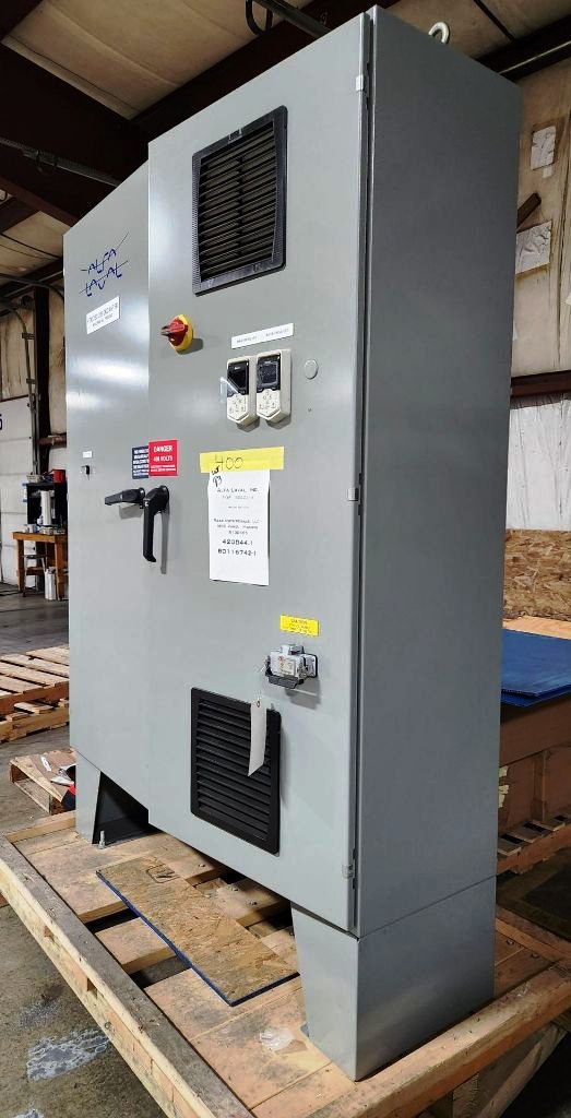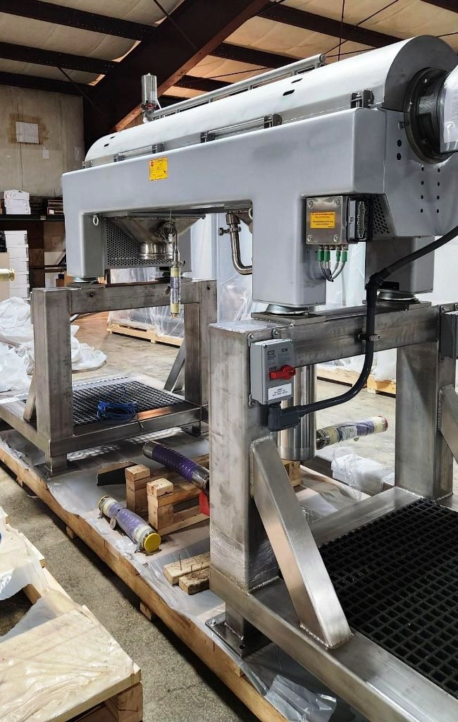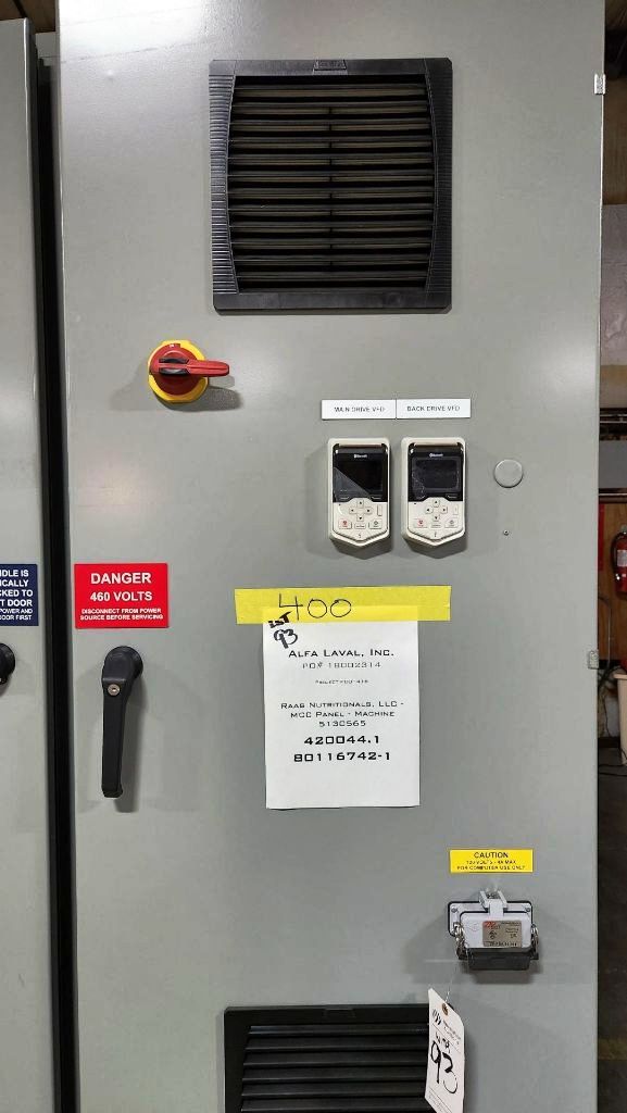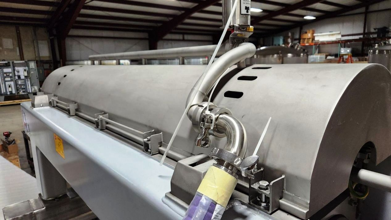 Max bowl speed 4400 RPM, 3030 x G, 11 x 38.6" bowl ID. 100mm single lead hardsurfaced conveyor, 15 HP motor 460/3/60/3525 RPM, 97:1 1.5 kNm gearbox, 10 HP backdrive, feed tube, guard, vibration isolators/switch, mounted on a raised SS platform skid with chutes and control panel with 2 VFDs. Includes casing spray headers with flush nozzles and bowl drain plug. 2020 vintage. Brand new; never used.