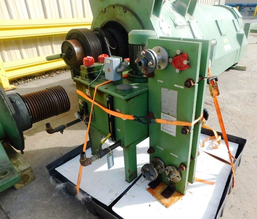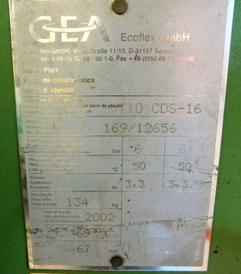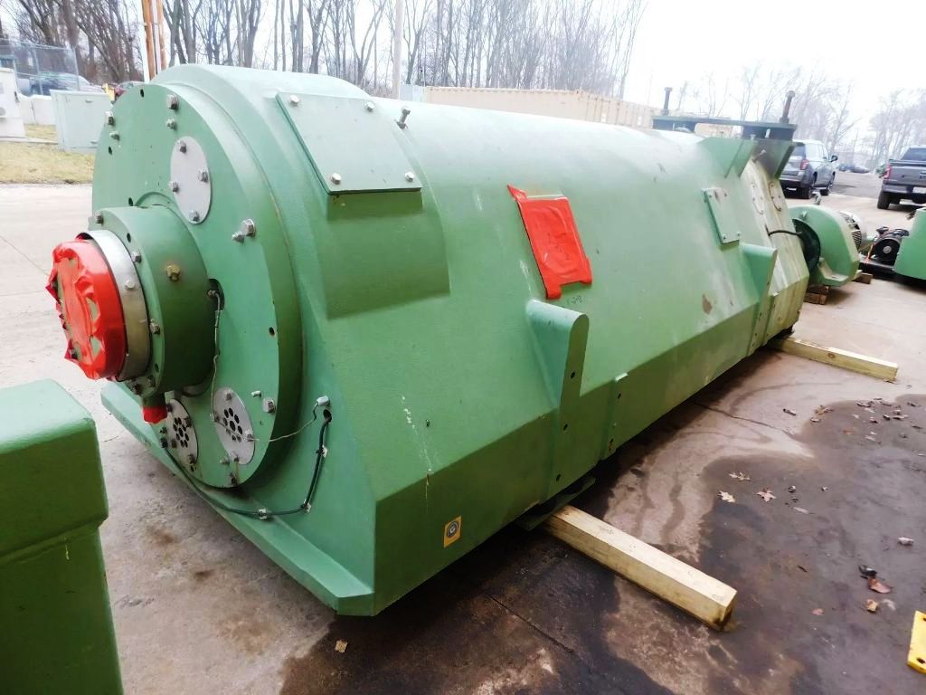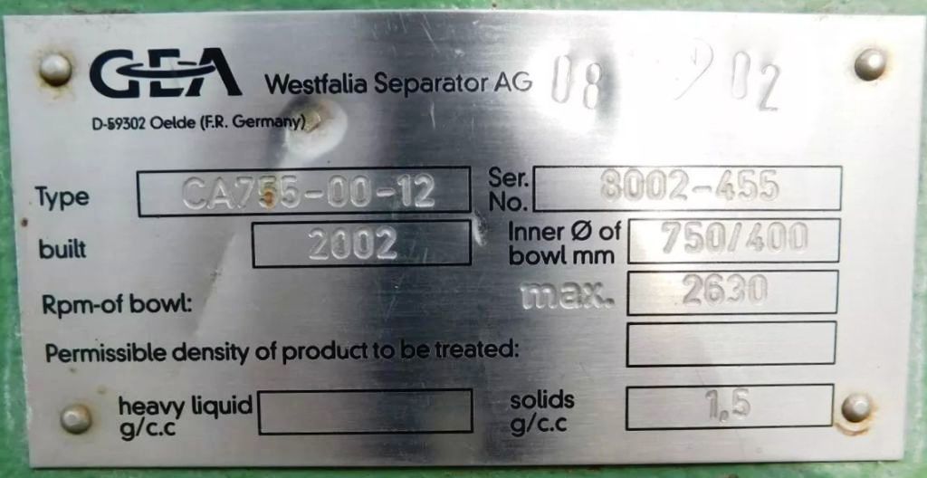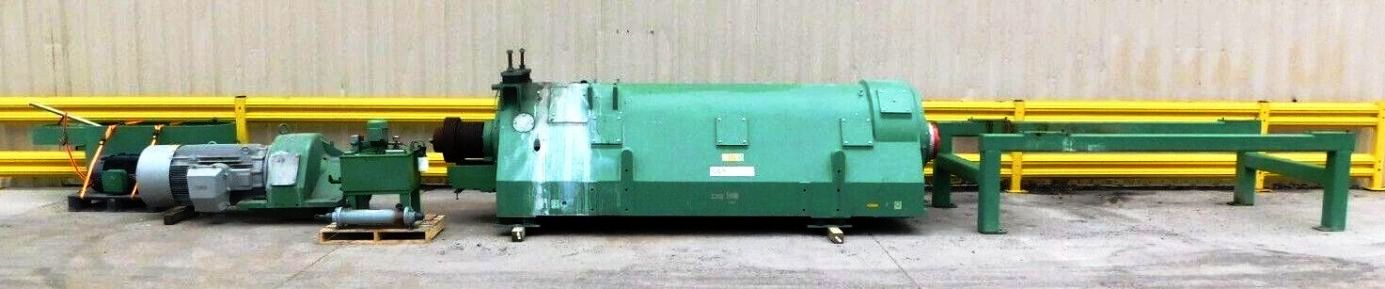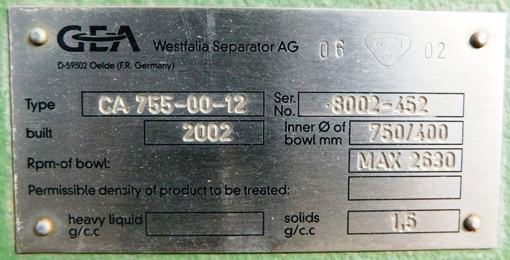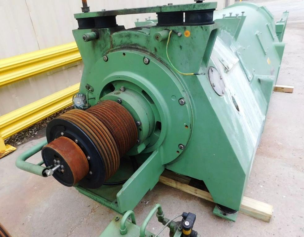 Max bowl speed 2630 RPM, 2900 x G, rated @ 60,000 LPH, liquid discharged under gravity. 10" single lead conveyor, 224 KW motor 460/3/60/3584 RPM, 30 KW backdrive, feed tube, guards, 100 W heat exchanger and stand. 2002 vintage. Very good condition.