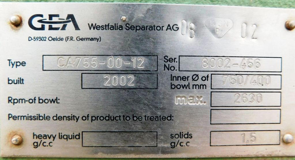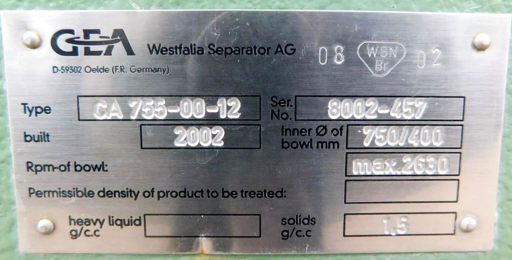 (7) Westfalia CA 755-00-12 decanter centrifuges, 2205SS. are engineered for high-efficiency separation in various industrial applications, particularly in the food and beverage, chemical, and wastewater treatment sectors. With a maximum bowl speed of 2630 RPM and a centrifugal force of 2900 x G, these centrifuges are capable of handling substantial volumes of liquid, rated at an impressive 60,000 liters per hour (LPH). The design incorporates a 10-inch single lead conveyor that ensures effective solids discharge, while the liquid is discharged under gravity, promoting efficient operation and minimizing energy consumption. The robust 224 KW motor, operating at 460V/3/60/3584 RPM, combined with a 30 KW backdrive, provides the necessary power to maintain optimal performance even under demanding conditions. This equipment is particularly well-suited for continuous operation, making it a reliable choice for facilities that require consistent throughput and minimal downtime.