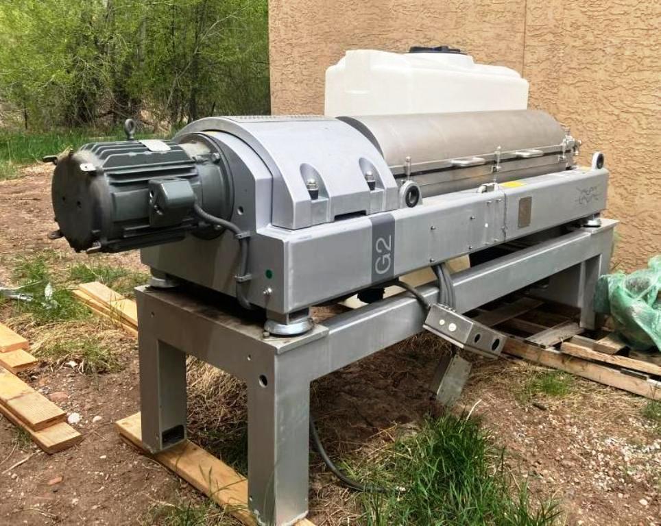 Max bowl speed 4000 RPM, 3158 x G, 6 degree beach, 360 degree cake ports, 110mm single lead TM42 hardsurfaced Esbjerg, 22 KW motor 380/3/50, 5.5 KW vari-speed backdrive, 1:57 3.5 kNm DD gearbox, guards, vibration switch/isolators, unitized on a stand. 2007 vintage. Very good condition.