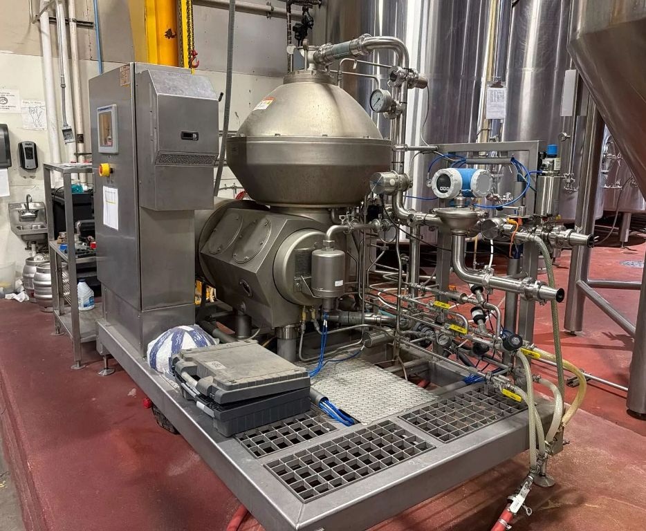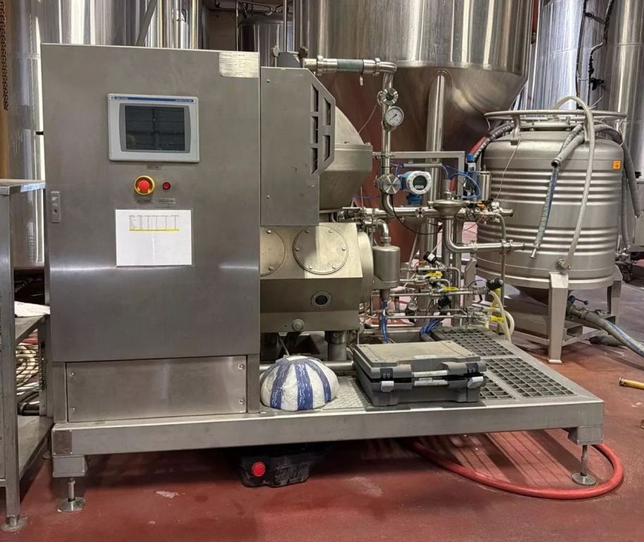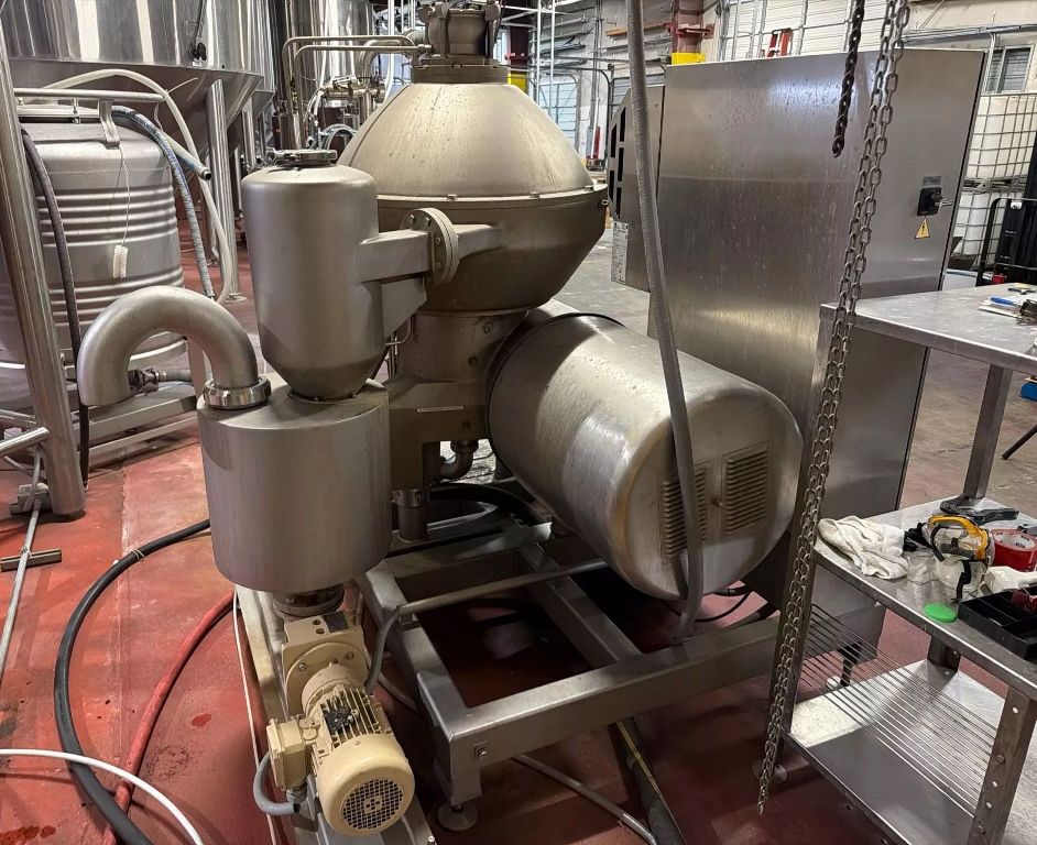 The Alfa-Laval BREW 250+ hermetic clarifier centrifuge module, 316SS, is engineered for high-efficiency separation processes, particularly in the brewing and beverage industries. With a maximum bowl speed of 6250 RPM, this centrifuge is capable of processing up to 250 hectoliters per hour (91 gallons per minute), making it an ideal solution for large-scale operations that demand both speed and precision. The unit features a Netzsch solids discharge pump that ensures effective removal of solids while maintaining optimal liquid clarity. The integrated sludge cyclone further enhances the separation process, allowing for the efficient handling of various feed materials while minimizing downtime and maintenance needs. The 18.5 KW motor operates at 460 volts, 3-phase, and 60 Hz, providing robust power and reliability, complemented by a variable frequency drive (VFD) that allows for precise control over the centrifuge's operational parameters.