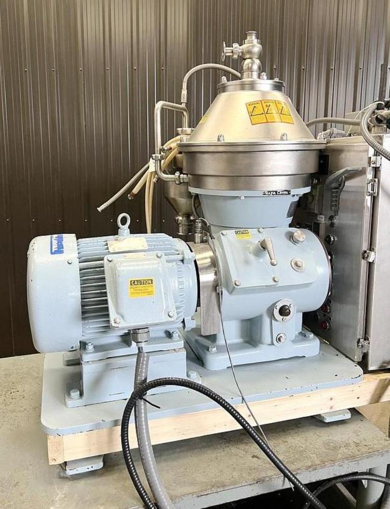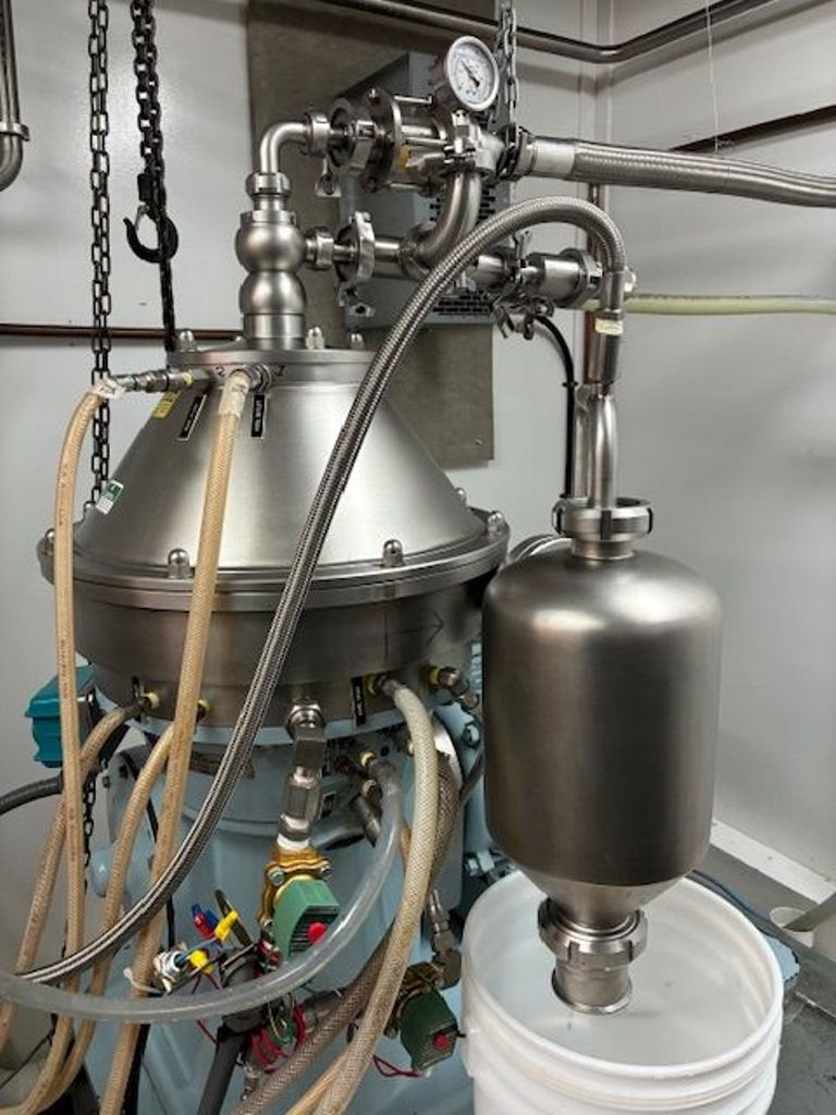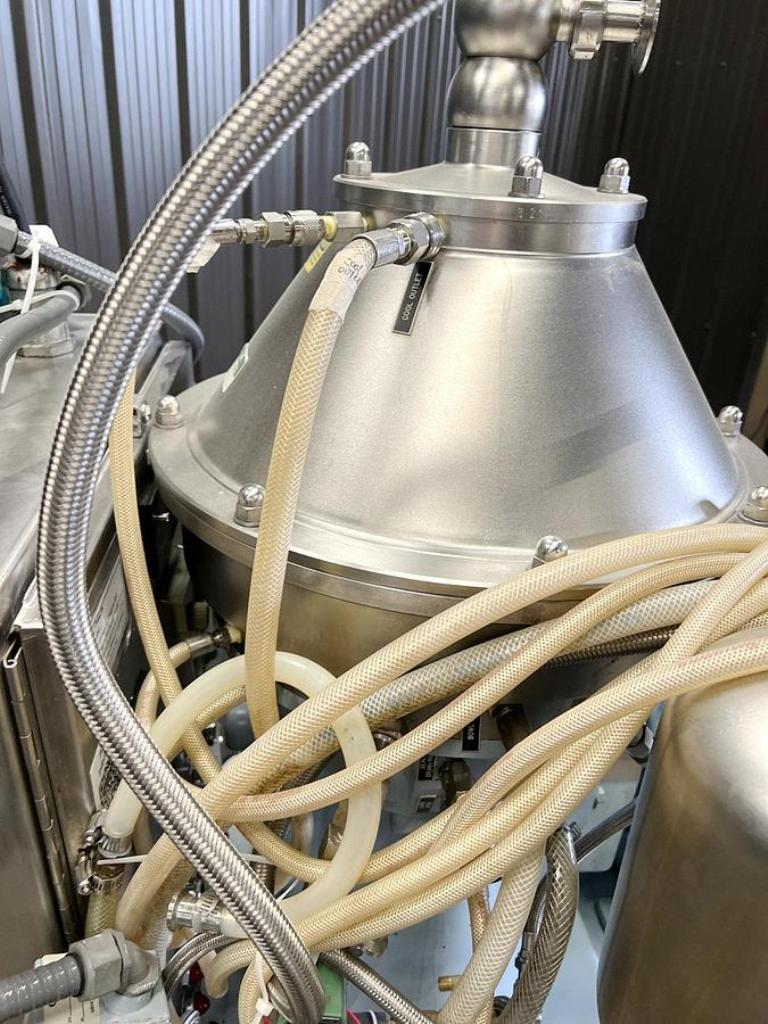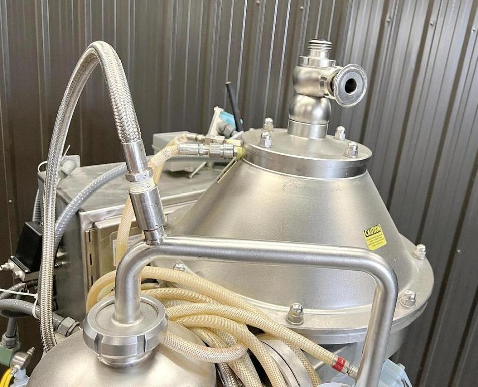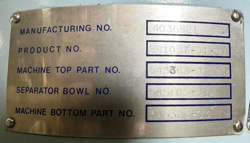 Max bowl speed 9650 RPM, 12,800 x G, steam sterilizable, gastight, liquid phase discharged under pressure, 7.5 HP XP motor 230/460/3/60/3490 RPM, sludge cyclone, piping, water harness and PLC control panel on a skid with tools and manuals. Very good condition. Located in Canada.