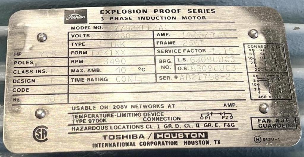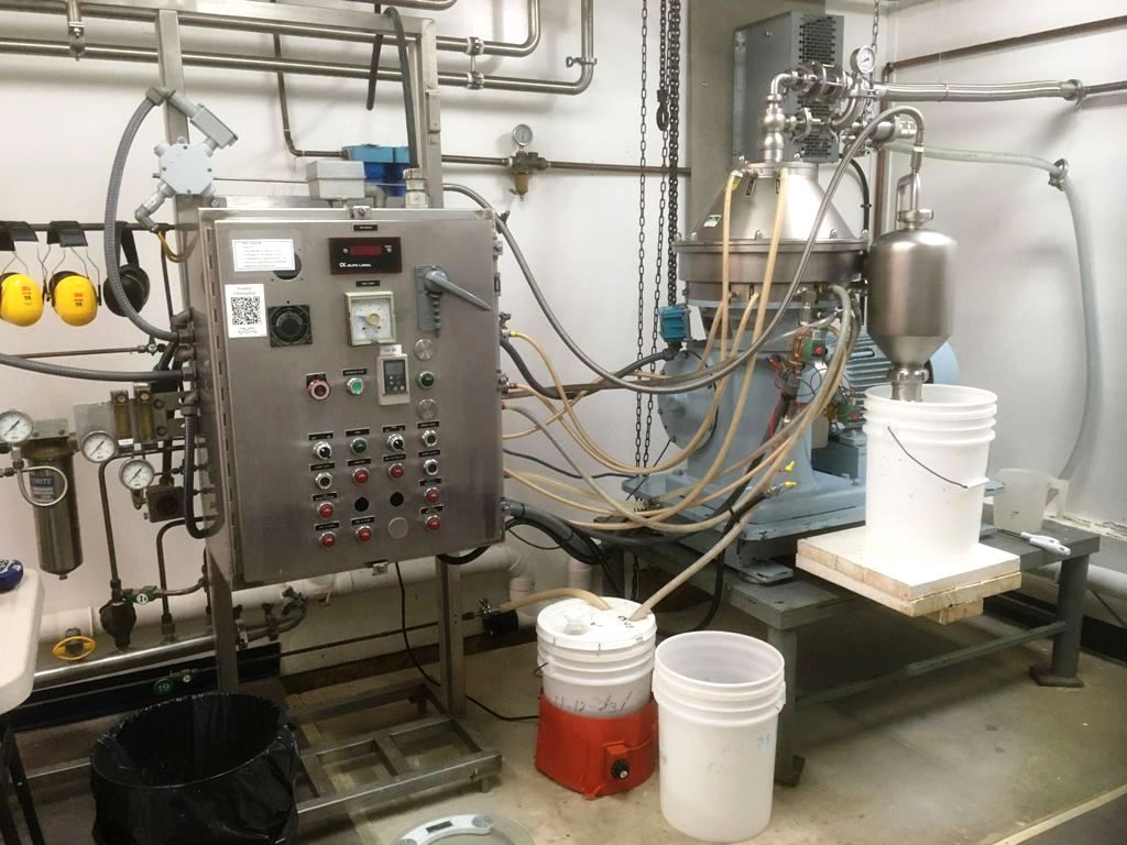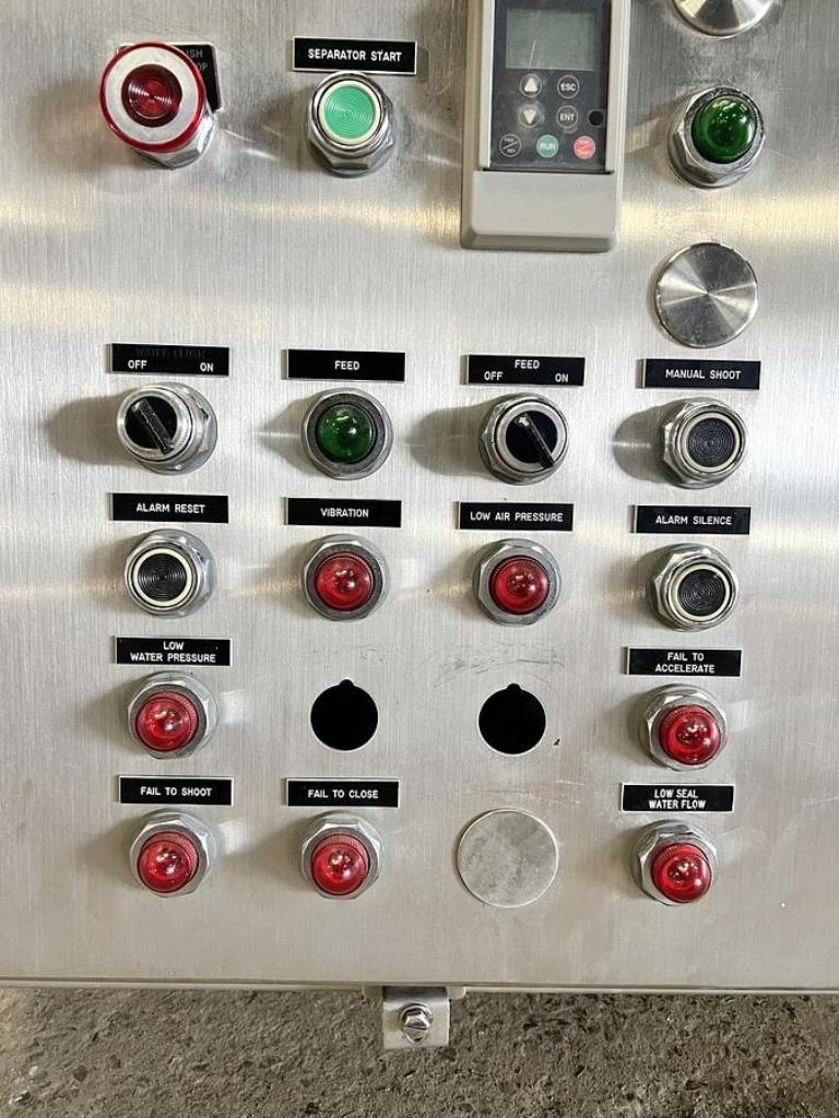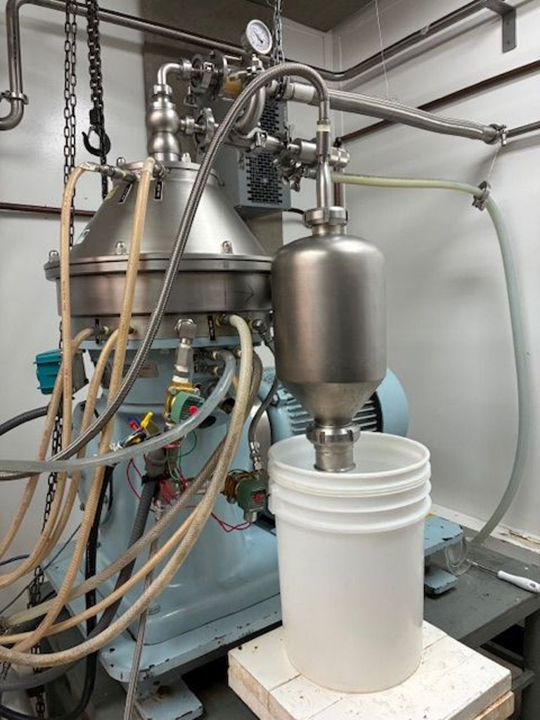 Max bowl speed 9650 RPM, 12,800 x G, steam sterilizable, gastight, liquid phase discharged under pressure, 7.5 HP XP motor 230/460/3/60/3490 RPM, sludge cyclone, piping, water harness and PLC control panel on a skid with tools and manuals. Very good condition. Located in Canada.