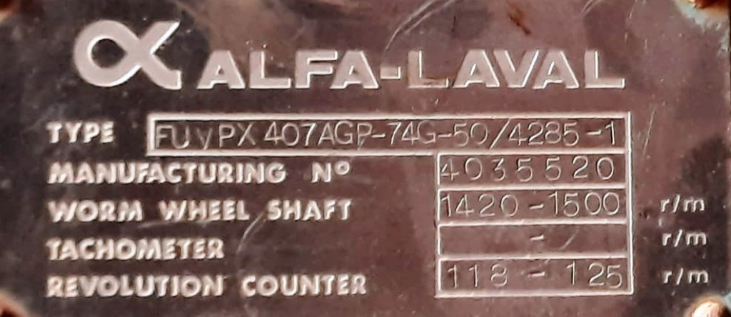 The Alfa-Laval FUVPX 407 AGP-74G-50 oil concentrator, 316SS. is engineered for high-efficiency separation of oil and water, making it an essential piece of equipment in various industrial applications. With a maximum bowl speed of 6250 RPM, this concentrator is designed to optimize the separation process, ensuring that both liquid phases are discharged effectively by gravity. The unit is powered by a robust 6.6 KW motor, compatible with multiple voltage configurations (380/440/3/50/60), which allows for flexibility in installation and operation across different facilities. This versatility makes the Alfa-Laval FUVPX 407 AGP-74G-50 an ideal choice for industries looking to enhance their oil recovery processes while minimizing waste and environmental impact.