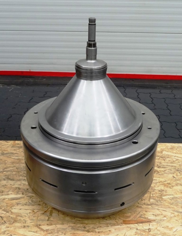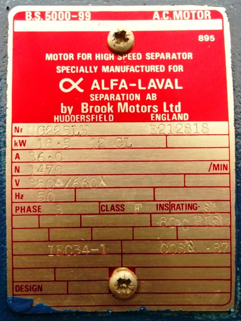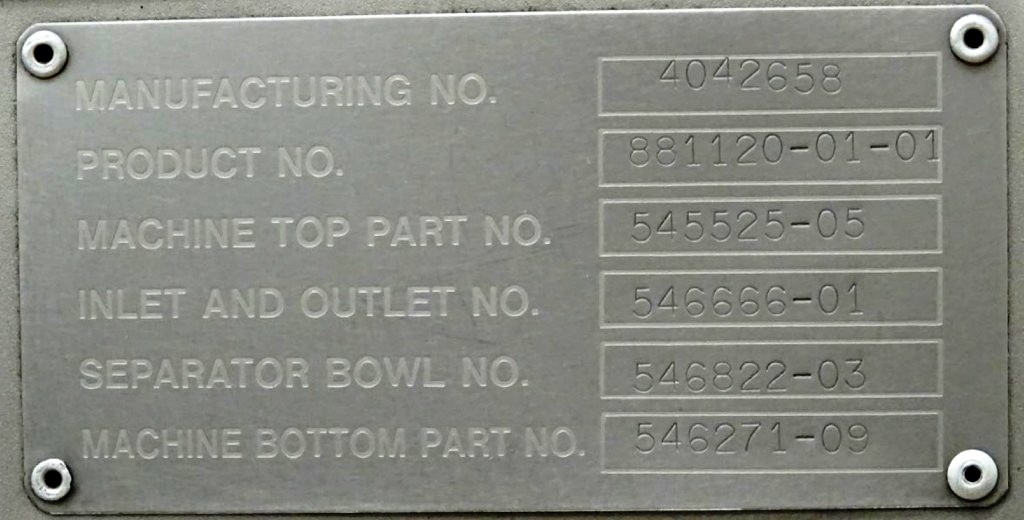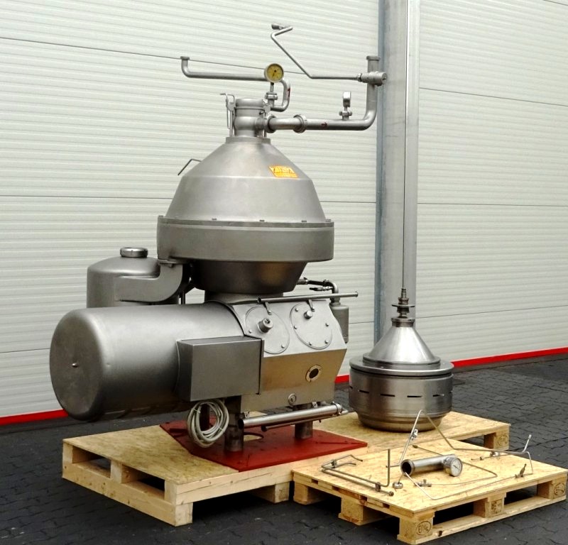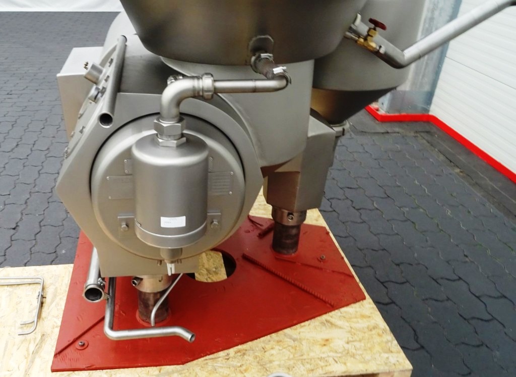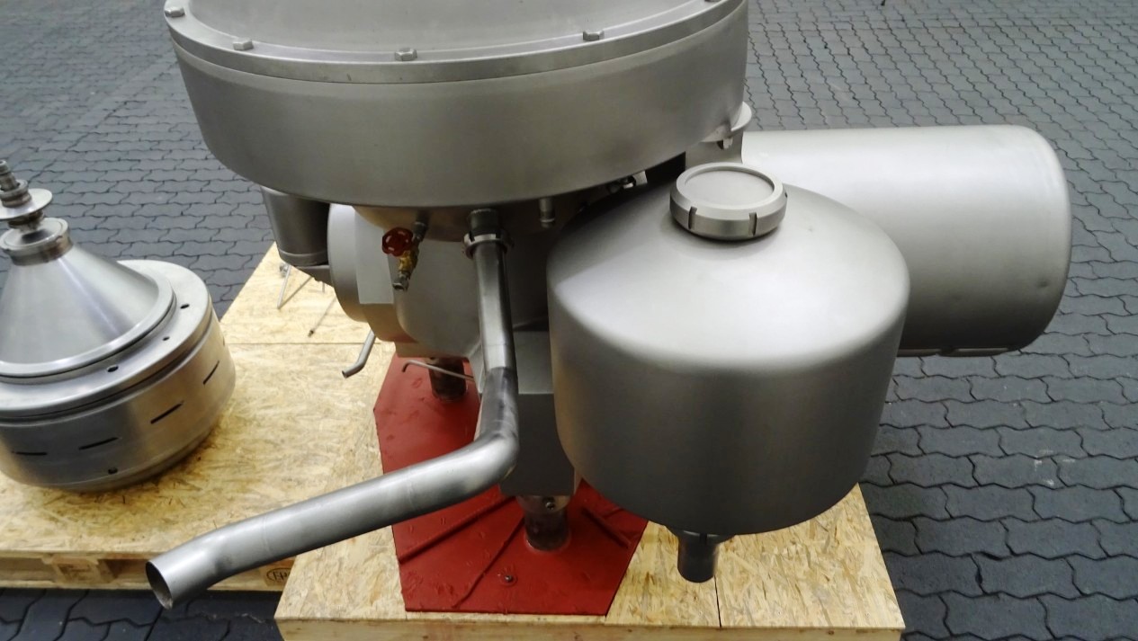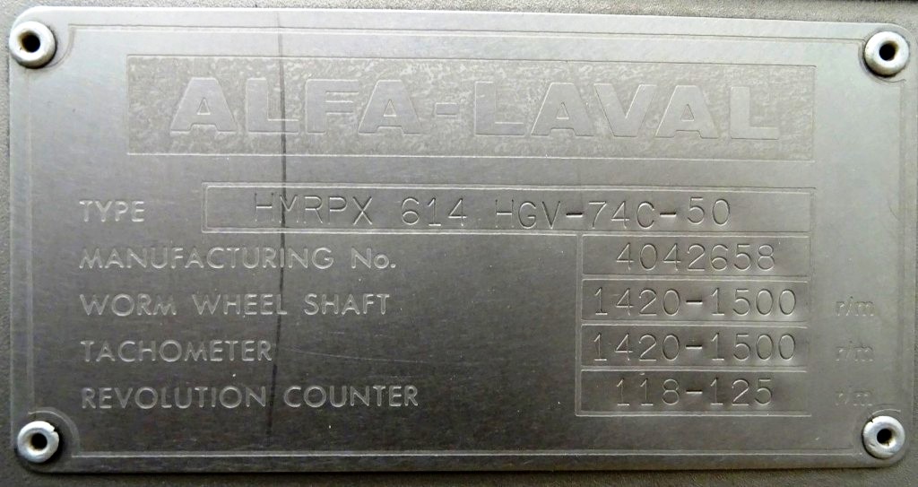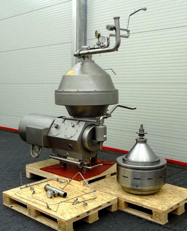 Max bowl speed 4266 RPM, rated @ 18,000 LPH skimming, 25,000 LPH standardizing. 18.5 KW motor 380/3/50/1470 RPM with fluid clutch, water harness, sludge cyclone, CPMI back-pressure valve, cream screw, skim milk pressure gauge and base plate. No tools or controls. Very good condition. Located in Europe.