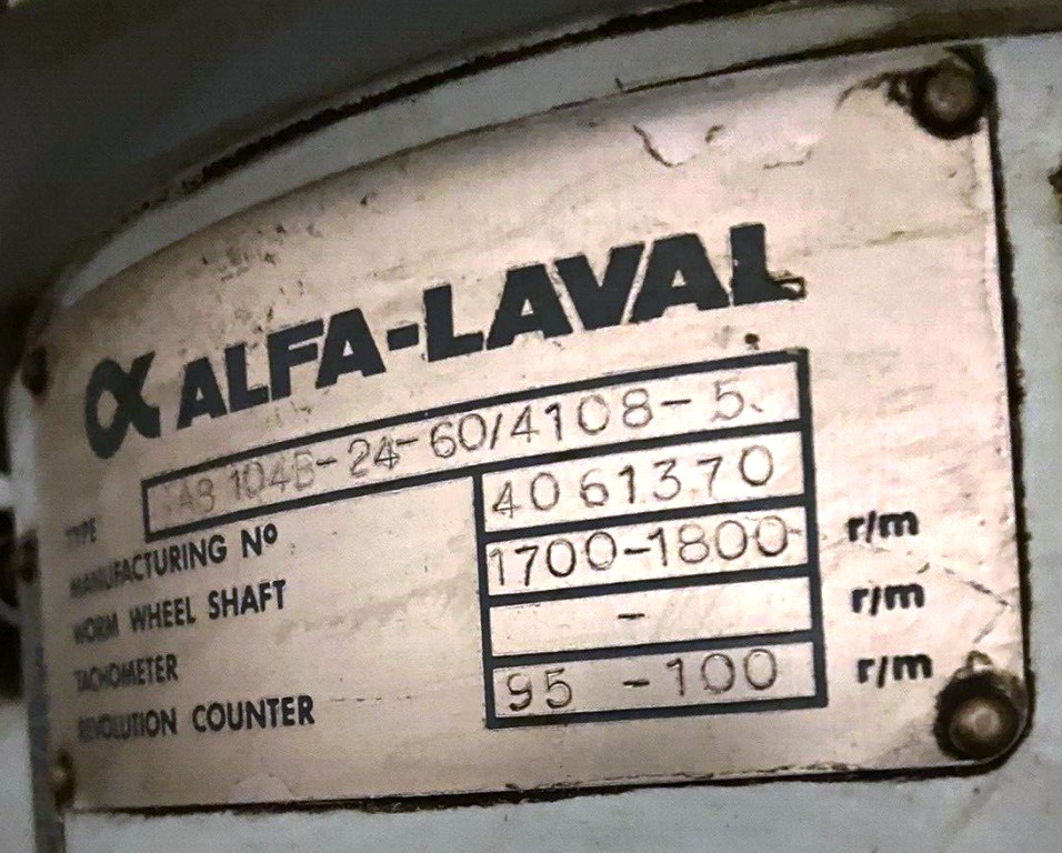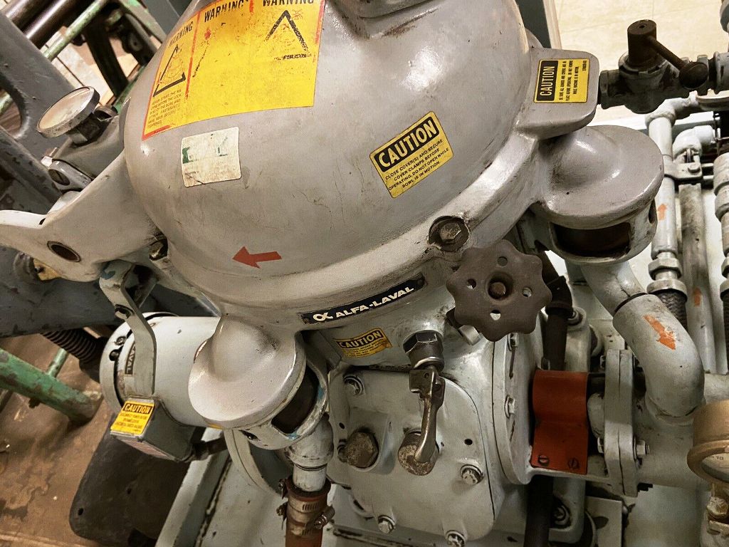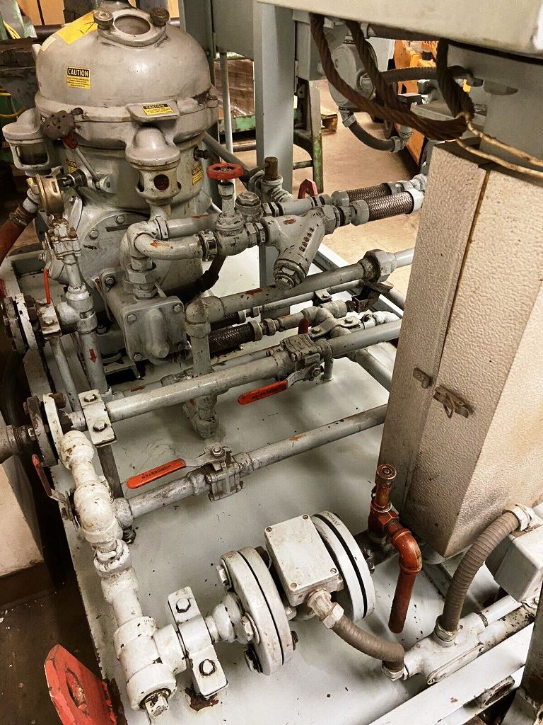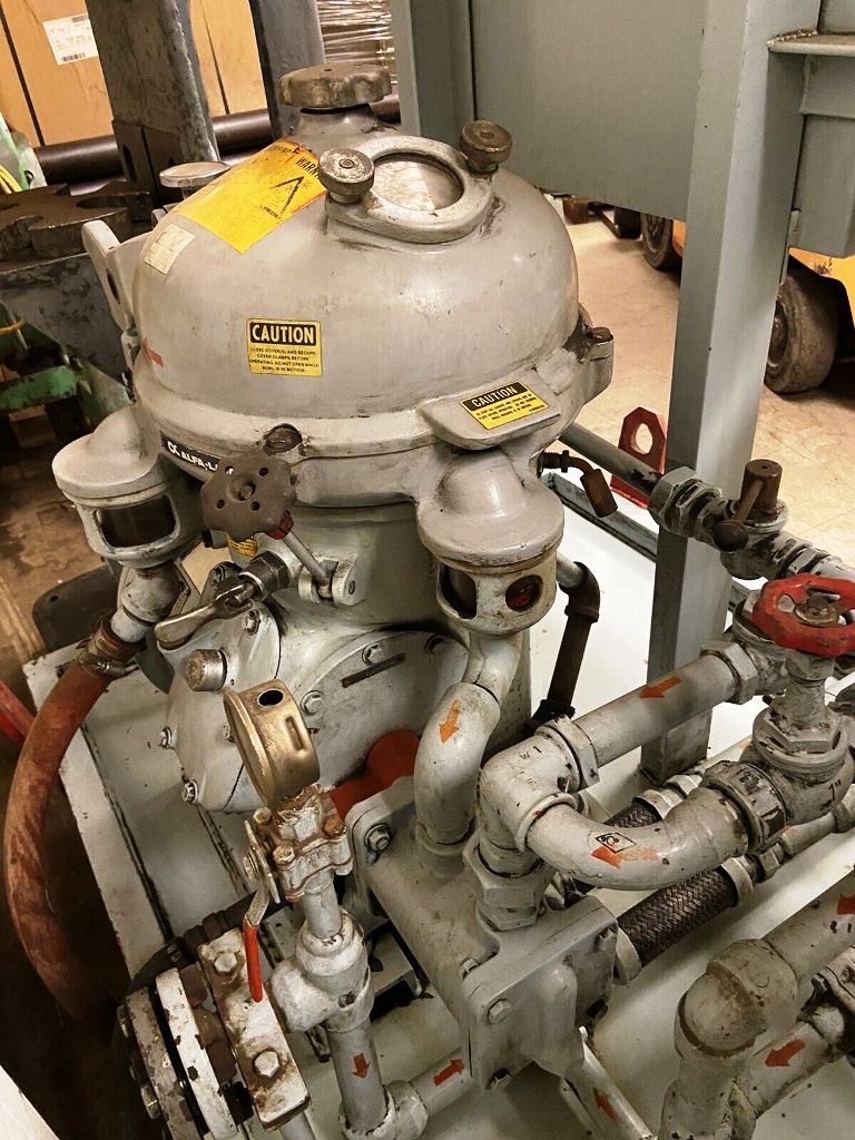The Alfa-Laval MAB 104B-24-60 oil purifier skid is engineered for high-efficiency oil purification, making it an essential asset for industries that require the removal of contaminants from lubricating oils and fuels. With a maximum bowl speed of 7350 RPM, this unit is capable of achieving a rated throughput of 2100 liters per hour (9 gallons per minute), ensuring that operations can maintain optimal performance without unnecessary downtime. The robust 2 HP motor operates at 460 volts, 3-phase, 60 Hz, and 1725 RPM, providing the necessary power to drive the purification process effectively. The inclusion of a feed and discharge pump, along with comprehensive piping, ensures seamless integration into existing systems, allowing for efficient oil handling and processing.