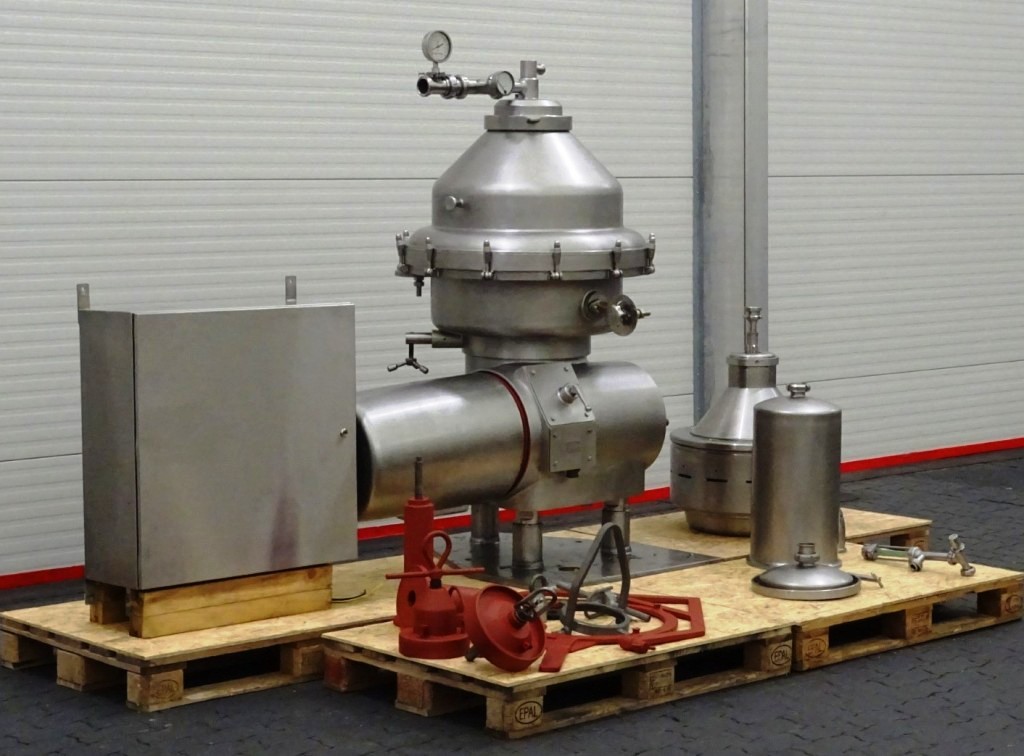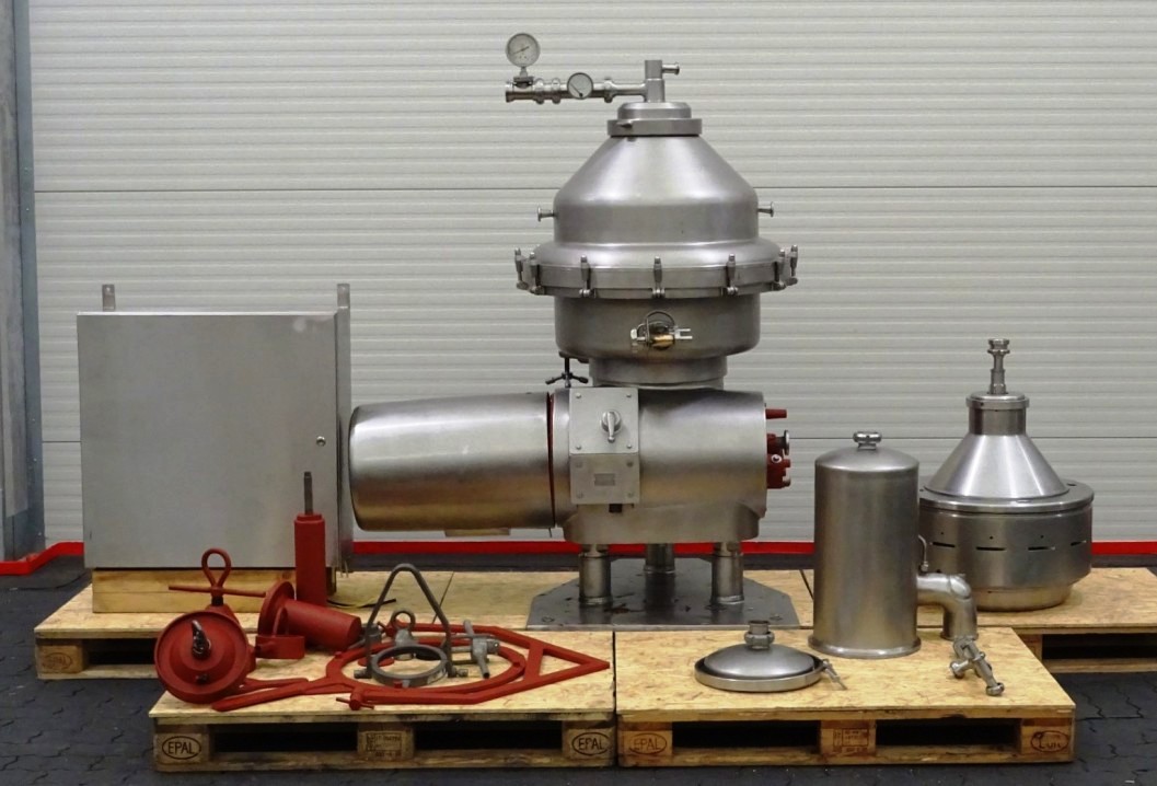 Max bowl speed 4450 RPM, rated @ 15,000 LPH on hot milk. 15 KW motor 380/3/50/1450 RPM with sludge cyclone, all inlet / outlet pipes, flow indicator, counter pressure valve, base plate and tools. Very good condition. Located in Europe.