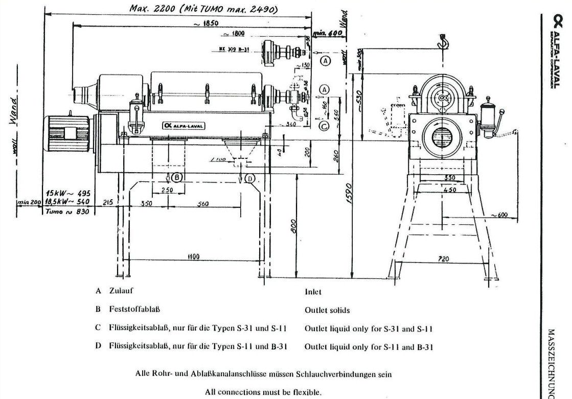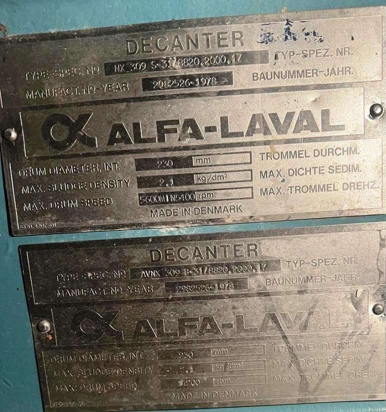 The Alfa-Laval NX 309S-31 decanter centrifuge, 316SS, is engineered to deliver exceptional performance in the separation of solids from liquids, making it an ideal choice for various industrial applications. With a maximum bowl speed of 5600 RPM and a centrifugal force of 4000 x G, this centrifuge is capable of efficiently processing a wide range of materials. Its robust construction, featuring high-grade 316 stainless steel, ensures durability and resistance to corrosion, which is crucial for maintaining operational integrity in demanding environments. The unit's dimensions of 9.2 x 27.6 inches provide a compact yet effective solution for facilities with space constraints while still achieving high throughput rates. The integrated pump on the liquid discharge enhances the efficiency of the separation process, allowing for a continuous flow of processed material, which is essential for maintaining productivity in industrial operations.