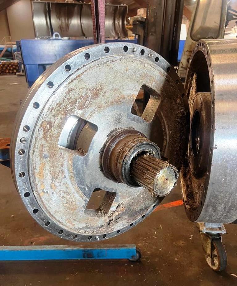 The Alfa-Laval NX 438B-31G decanter centrifuge, 316SS. is engineered for high-efficiency separation processes, particularly in industries such as food and beverage, wastewater treatment, and chemical processing. With a maximum bowl speed of 3650 RPM and a centrifugal force of 3575 x G, this decanter centrifuge is capable of handling a wide range of materials, ensuring optimal separation of solids and liquids. The bowl measures 480 x 2035mm (19 x 80 inches) and features a 10-degree beach angle, which enhances the sedimentation process, allowing for effective solid-liquid separation. The design includes 360-degree cake ports equipped with wear protection, ensuring durability and longevity even under continuous operation. The 6-inch single lead TC spray conveyor further aids in the efficient removal of separated solids, making this unit an excellent choice for demanding applications.