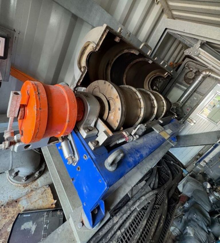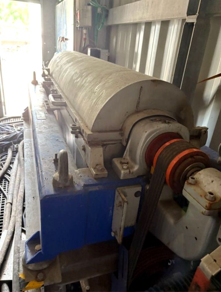 Max bowl speed 4000 RPM, 3158 x G, liquid discharged by gravity, 110mm hardsurfaced Esbjerg conveyor, 50 HP motor 230/460/3/60/1755 RPM, guards, 159:1 2.5 kNm gearbox, TA assembly, guards, feed tube, vibration switch/isolators and controls. 2011 vintage. Very good condition.
