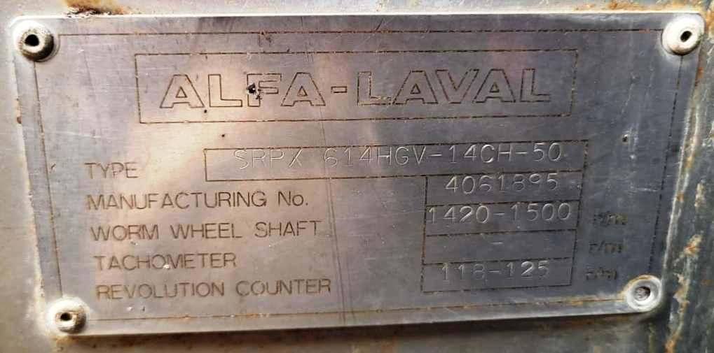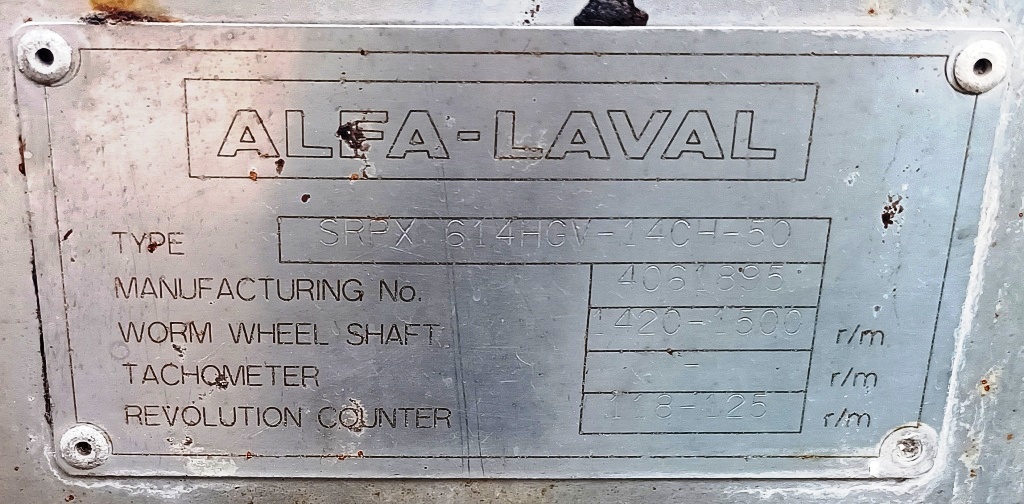 The Alfa-Laval SRPX 614 HGV-14CH-50 vegetable oil separator, 316SS. is engineered for high-efficiency separation of vegetable oils, making it an essential piece of equipment for various industrial applications. With a maximum bowl speed of 4800 RPM, this separator ensures rapid and effective separation of liquids, enhancing productivity in processing facilities. The hermetic bottom feed design allows for optimal feed flow, minimizing the risk of contamination and ensuring a clean separation process. This design feature is particularly beneficial in maintaining the quality of the vegetable oils being processed, as it reduces the exposure of the product to external elements.