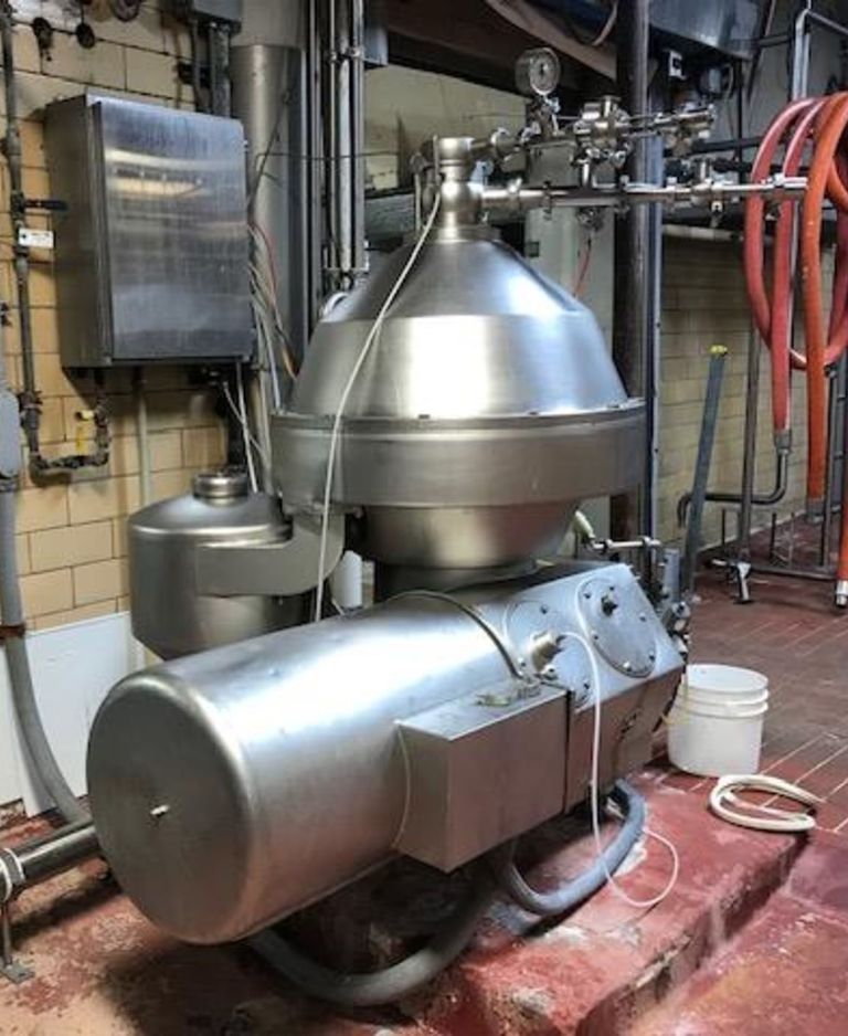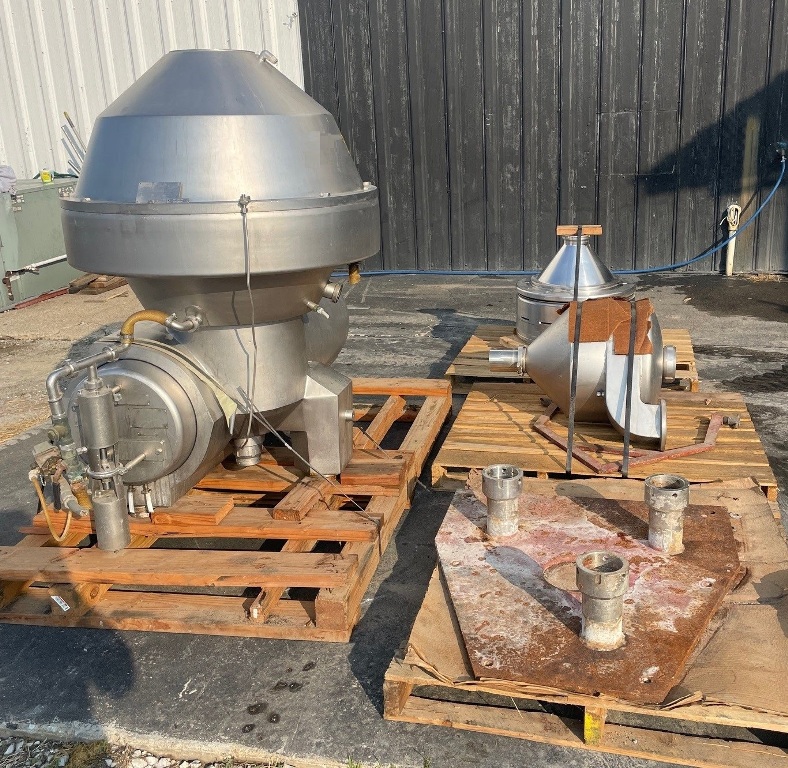 Max bowl speed 4800 RPM, hermetic bottom feed design, heavy liquid phase discharged under pressure, 30 HP motor 460/3/60/1760 RPM, solids cyclone, base frame, water harness, tools, control panel and manual. Very good condition.