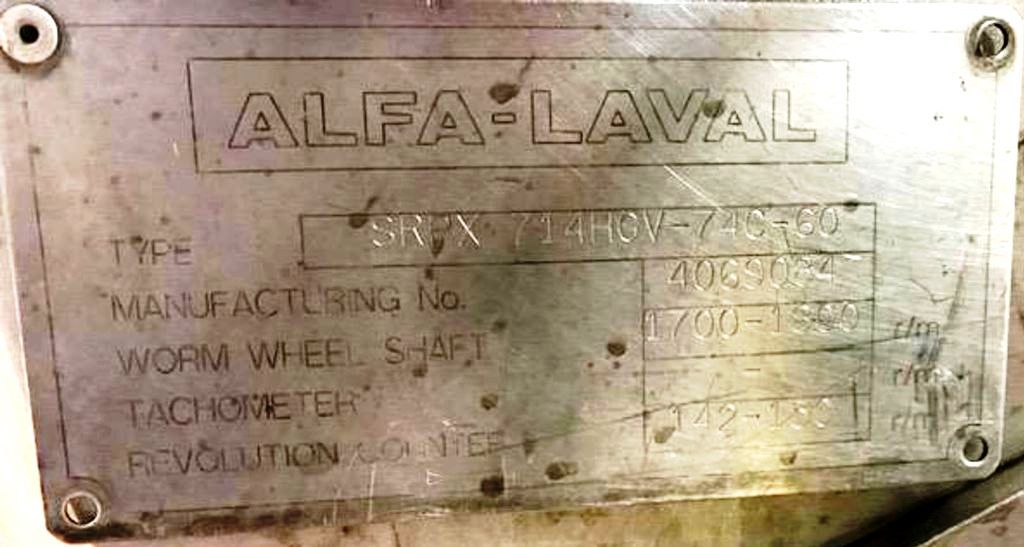 In terms of maintenance, the Alfa-Laval SRPX 714 HGV-74C-60 is designed for ease of access, allowing operators to perform routine checks and maintenance tasks with minimal downtime. Its durable construction ensures longevity and reliability, making it a valuable investment for any facility looking to enhance its oil processing capabilities. With its combination of advanced technology and user-friendly features, this concentrator stands out as an essential piece of equipment for businesses focused on maximizing efficiency and product quality in the vegetable oil industry.