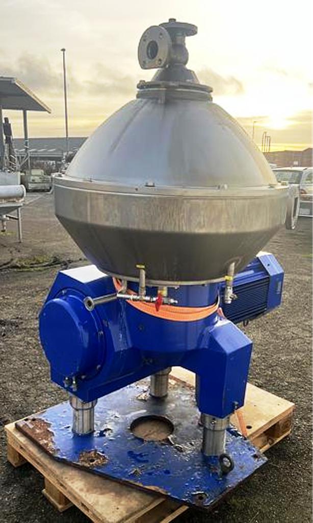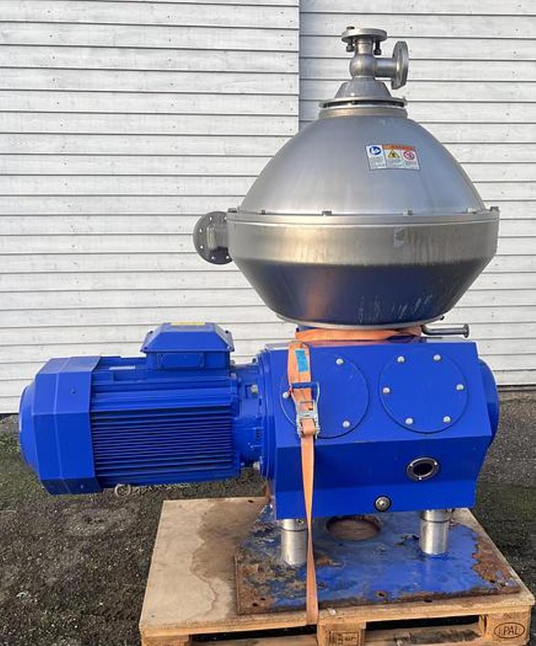 Max bowl speed 7200 RPM, rated at 10,000 LPH, bowl volume 15 L, sludge capacity 9.4 L, liquid discharged under pressure, solids discharge pump with cyclone tank, 30 KW motor 400/3/50/1480 RPM, base plate, tools and manual. 2011 vintage. Reconditioned to "as new" and test run. Located in Europe.