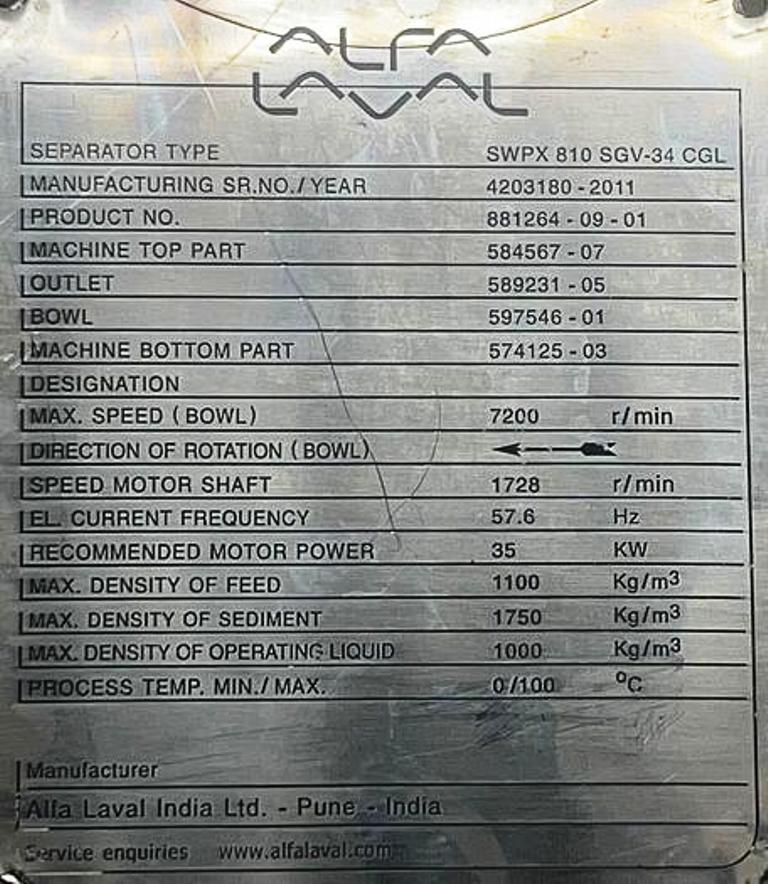 The Alfa-Laval SWPX 810 SGV-34CGL clarifier centrifuge, 316SS, is designed to deliver exceptional performance in the separation of liquids and solids, making it an invaluable asset for various industrial applications. With a maximum bowl speed of 7200 RPM, this centrifuge efficiently processes up to 10,000 liters per hour, ensuring high throughput and productivity. The bowl volume of 15 liters and a sludge capacity of 9.4 liters allow for effective handling of large volumes of material, while the liquid is discharged under pressure, enhancing the operational efficiency and reducing the risk of contamination. The solids discharge pump, equipped with a cyclone tank, further optimizes the separation process, allowing for continuous operation without the need for manual intervention, thereby minimizing downtime and labor costs.