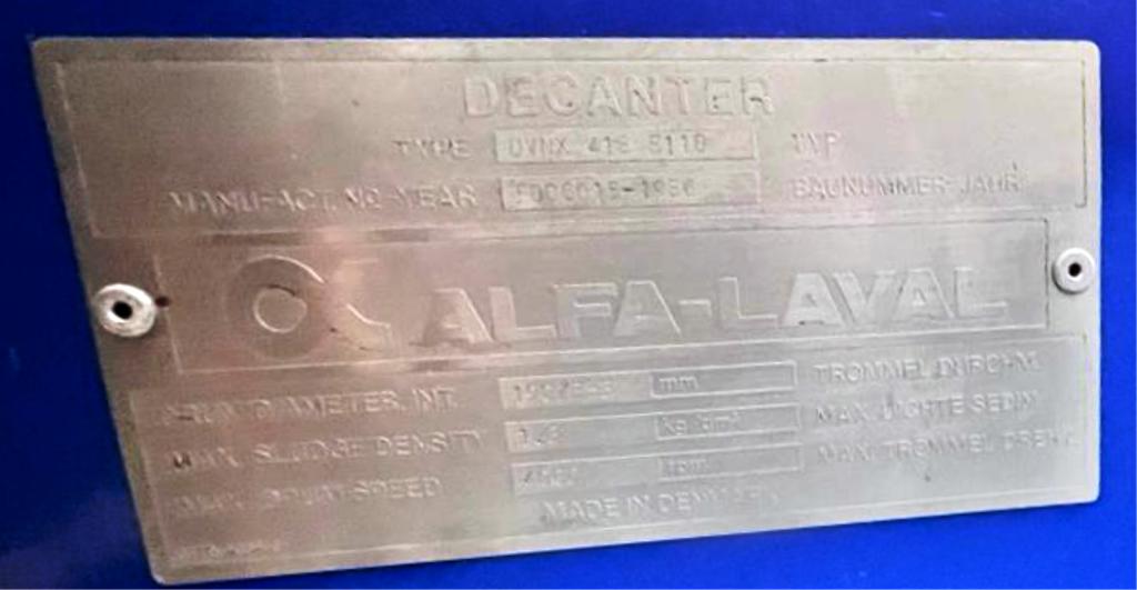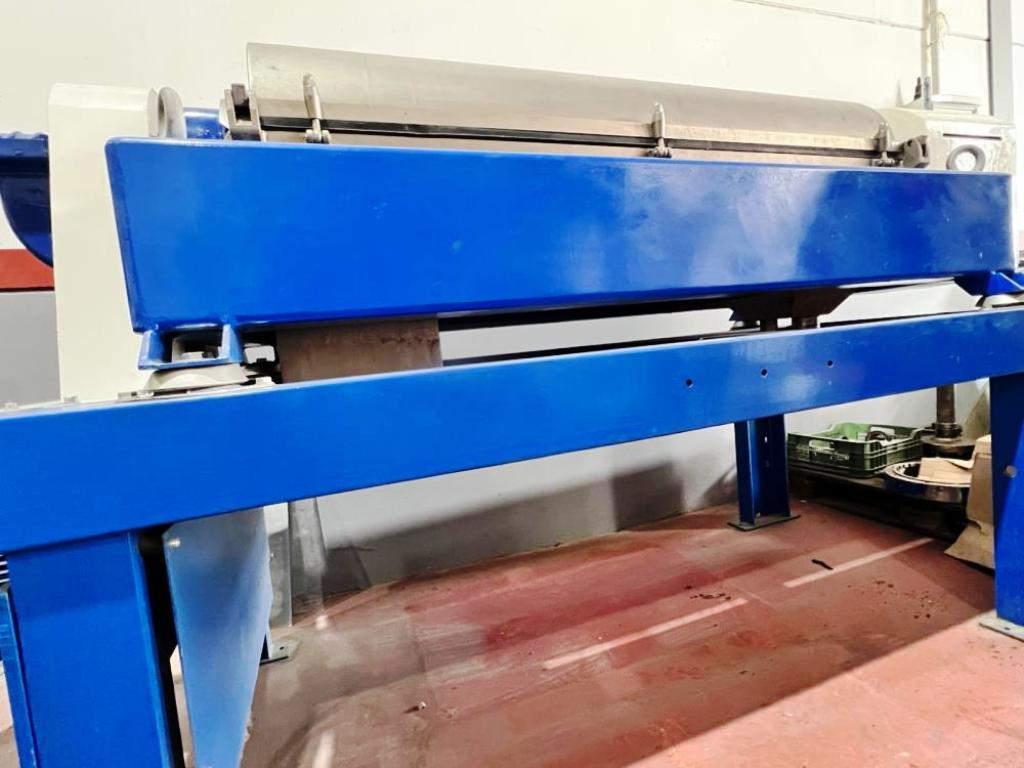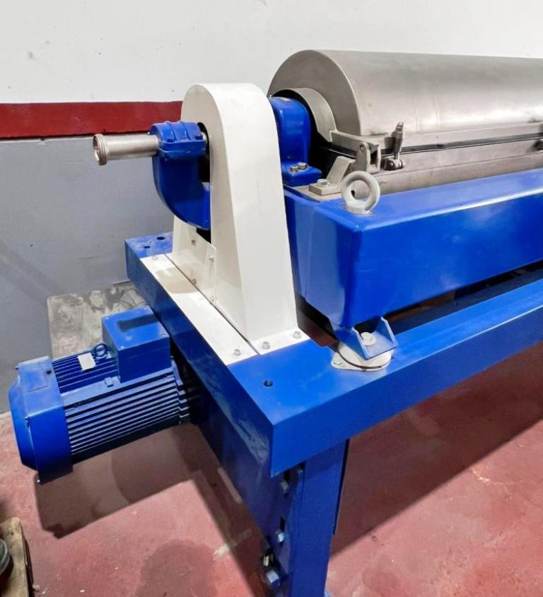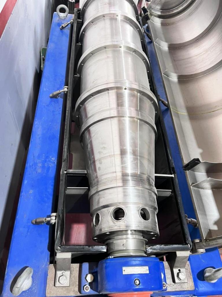 Max bowl speed 4000 RPM, 70mm single lead hardsurfaced conveyor, single row of lined cake ports, 159:1 gearbox, 22 KW motor 380/3/50/1450 RPM, 4 KW fixed speed backdrive, feed tube, vibration switch/isolators, guards and chutes unitized on stand. Prior use: Olive oil. 1986 vintage. Very good condition. Located in Europe.
