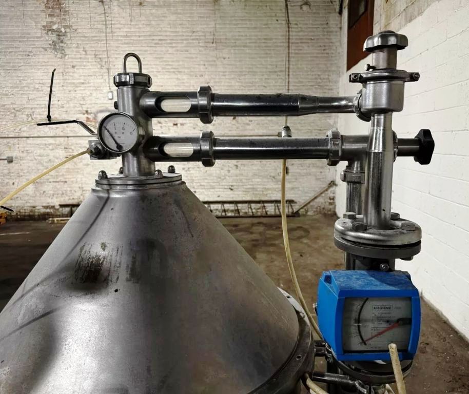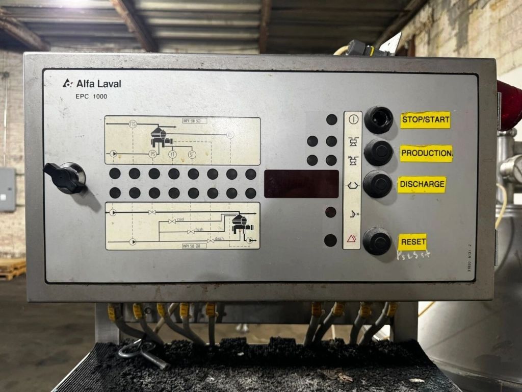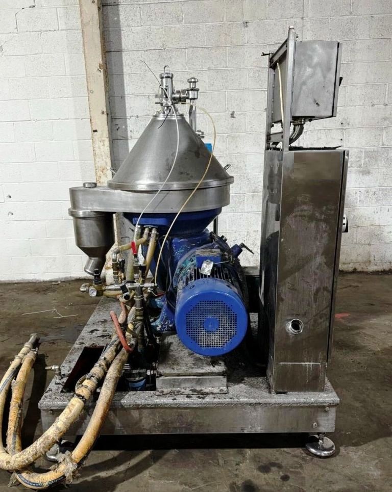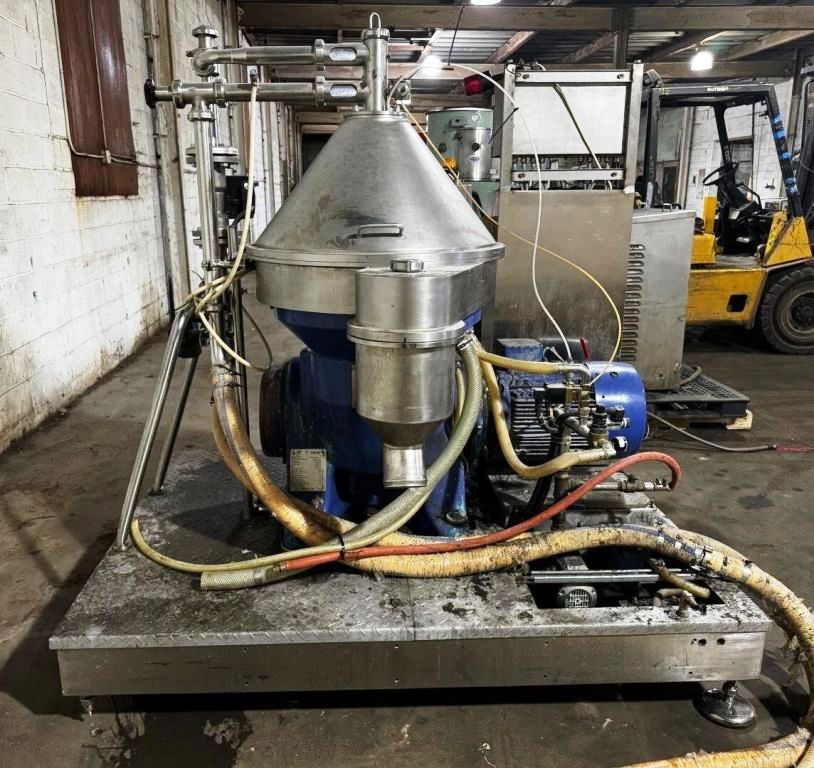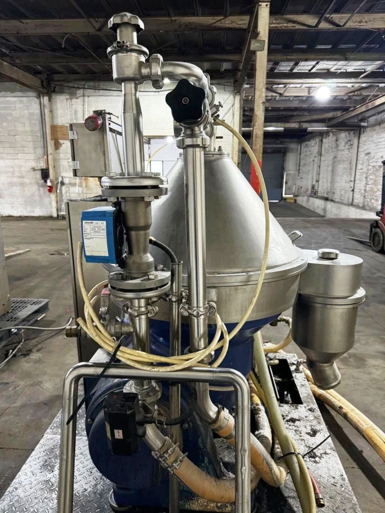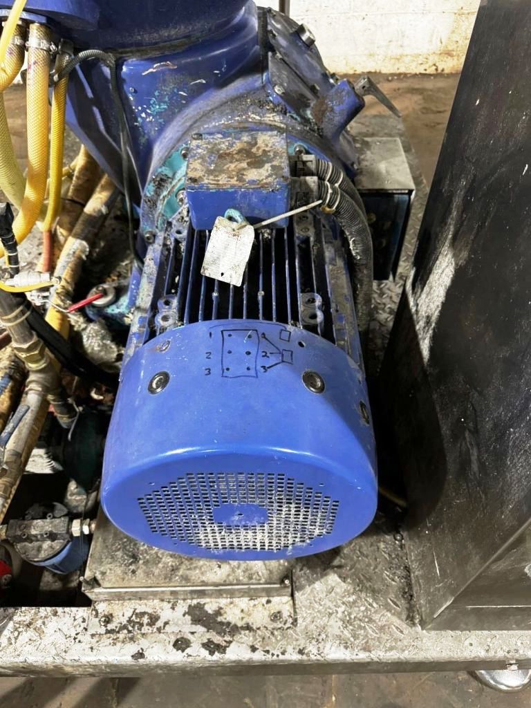 Max bowl speed 6235 RPM, timed solids discharge, liquid discharged under pressure, 22 KW motor 460/3/60/1750 RPM, sludge cyclone, all valves, gauges, piping, feed pump and control panel on a skid. 1996 vintage. Very good condition.
