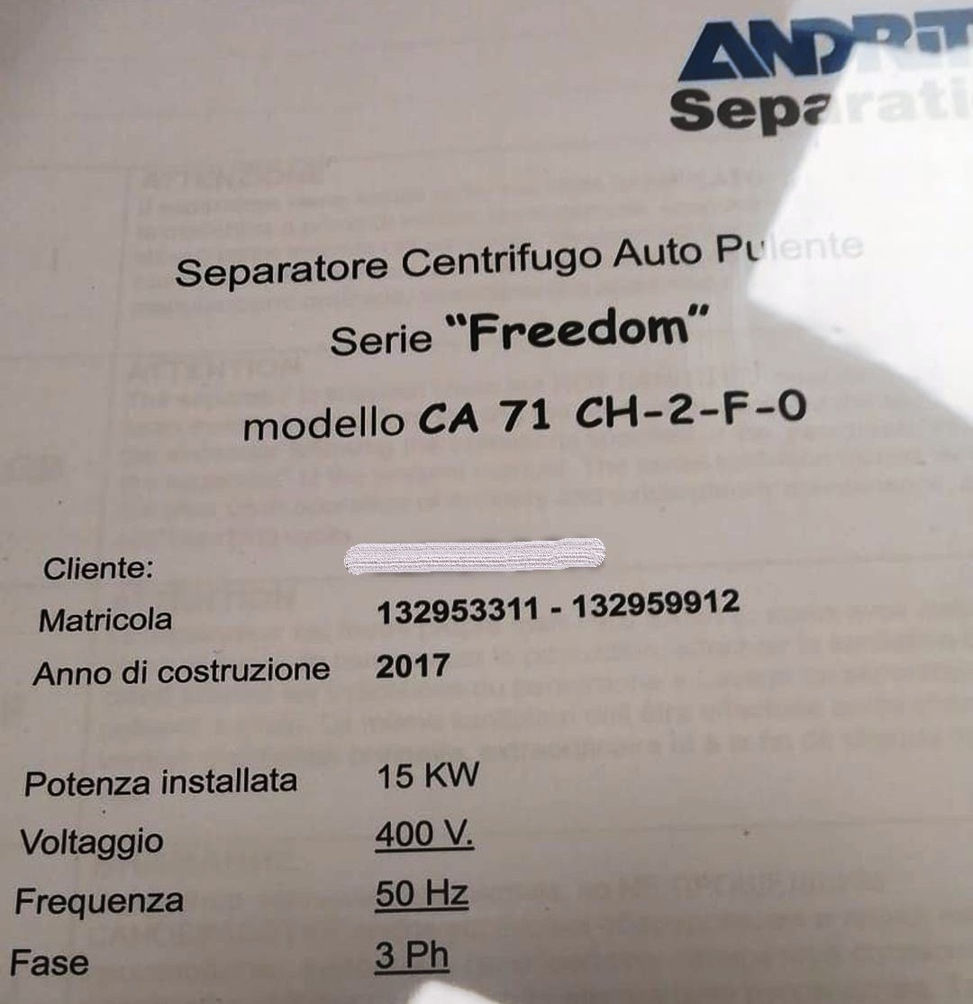 The Andritz-Frautech Freedom CA 71 CH-2-F-0 hermetic wine clarification skid, 316SS, is designed to meet the rigorous demands of modern winemaking processes. With a maximum bowl speed of 6800 RPM, this skid is capable of efficiently clarifying wine at a rated capacity of 3500 liters per hour. The 18-liter bowl volume allows for substantial processing of wine, while the 5-liter sludge space ensures that sediment and impurities are effectively separated, resulting in a cleaner and more refined final product. Operating at a pressure of 6 Bar, this unit is engineered to maintain optimal performance under varying conditions, making it a reliable choice for wineries looking to enhance their production capabilities.