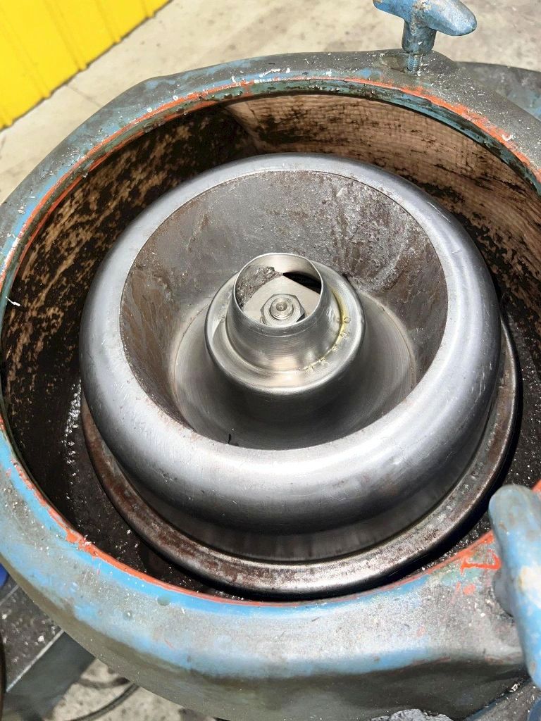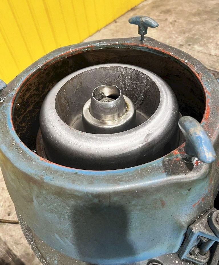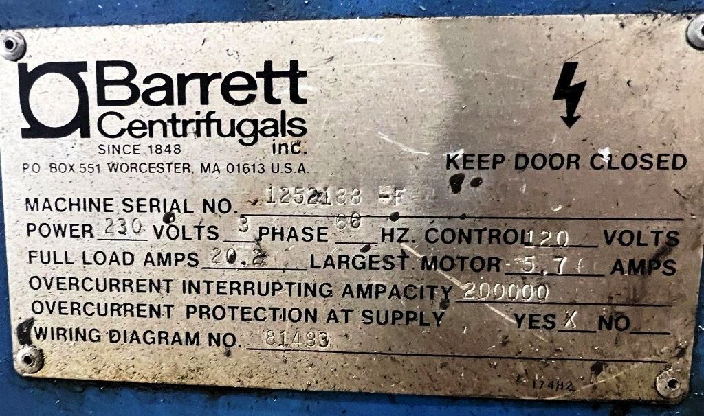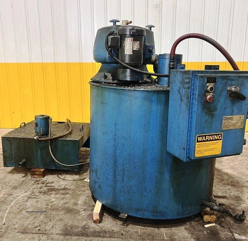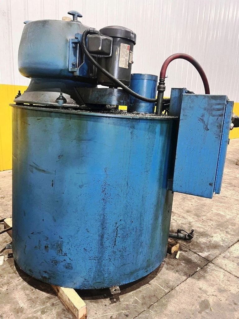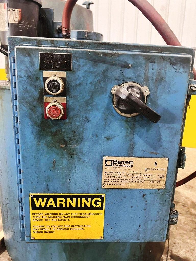Rated @ 2-5 GPM. Aluminum casing. For contaminated cutting oil or coolant with little or no tramp oil. Sludge-bearing liquid is pumped to the 2 HP Clarifuge where sludge is removed @ 2200 x G, liquid flows back to the 170 gal clarifier tank and is recirculated through the Clarifuge for the time required to obtain the clarity and aeration necessary for reuse. When clarification is complete, the fluid is removed by the transfer pump. Complete with NEMA 12 control panel and circulating pump. Very good condition.