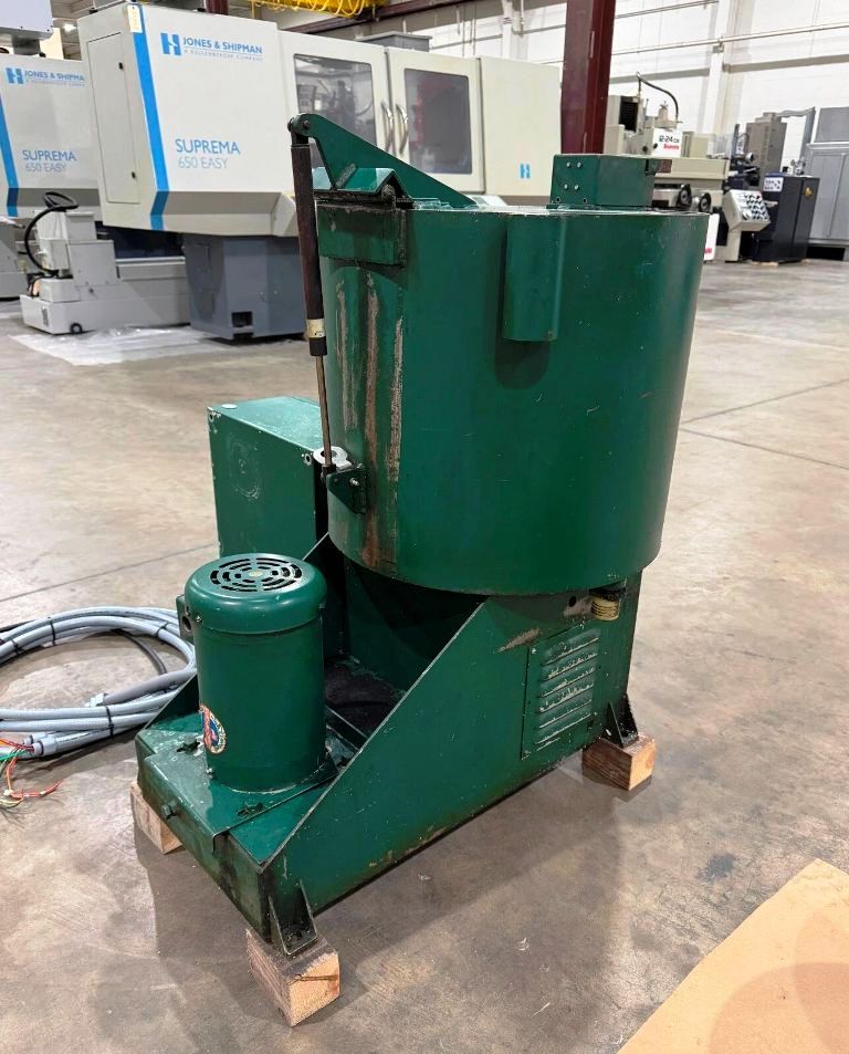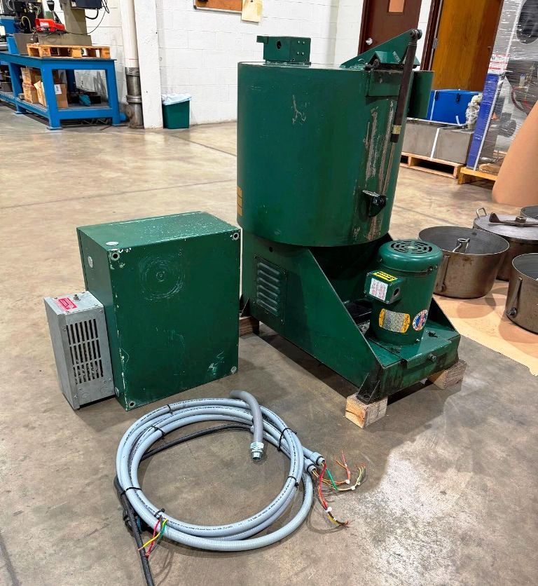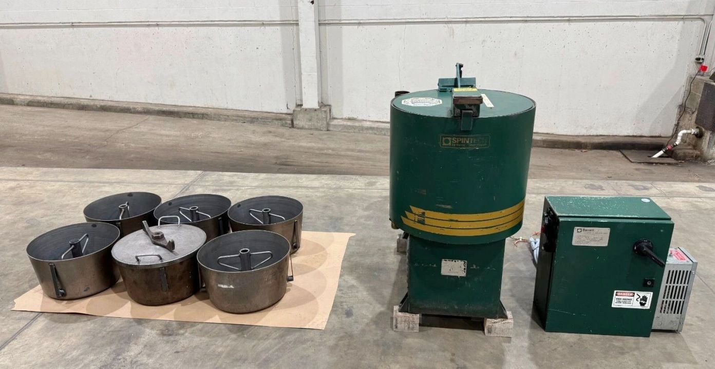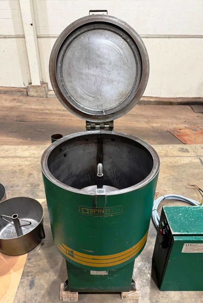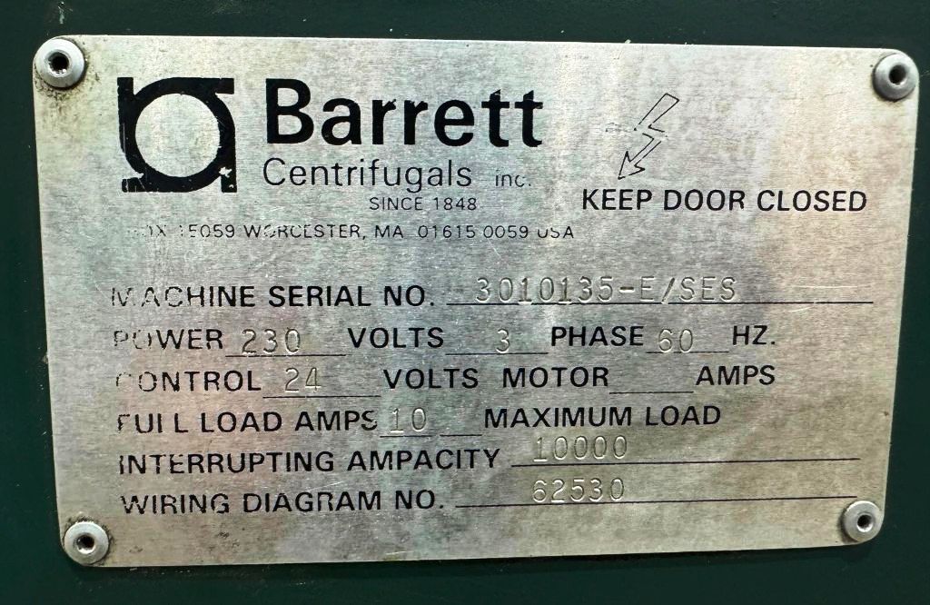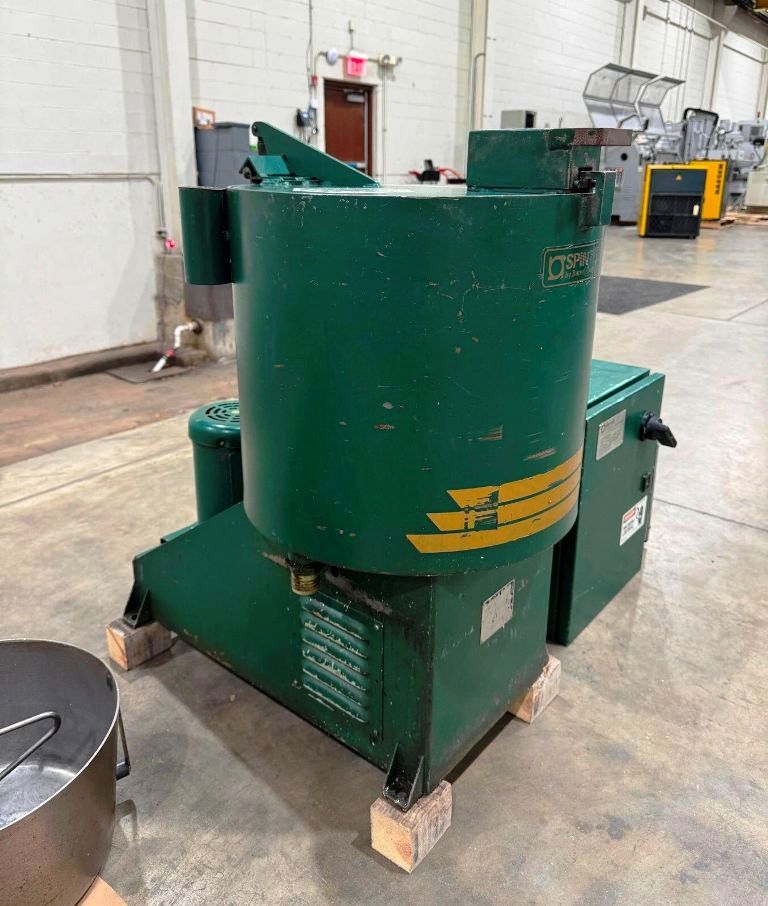 Max bowl speed 1200 RPM, 327 x G, 16 x 9" basket ID, rated @ 75 lbs/batch, 2 HP motor 230/3/60 with Allen Bradley Micrologix PLC and Omron SYS-Drive AC Inverter. (6) 5 gallon solid spun chip pans. Very good condition. 2005 vintage.