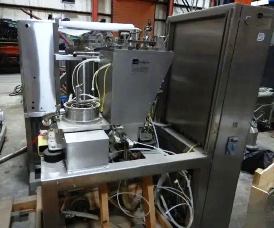 Max bowl speed 15,325 RPM, 20,000 x G, rated @ 60 LPH, bowl capacity 1 L. 316L SS construction with titanium bowl assembly, plow, 1.5 HP motor 230/1/60/3450 RPM, Allen-Bradley PanelView 550 PLC control panel with VFD, unitized on a skid with all piping, valves, manuals and separate CIP/SIP skid. Excellent condition.