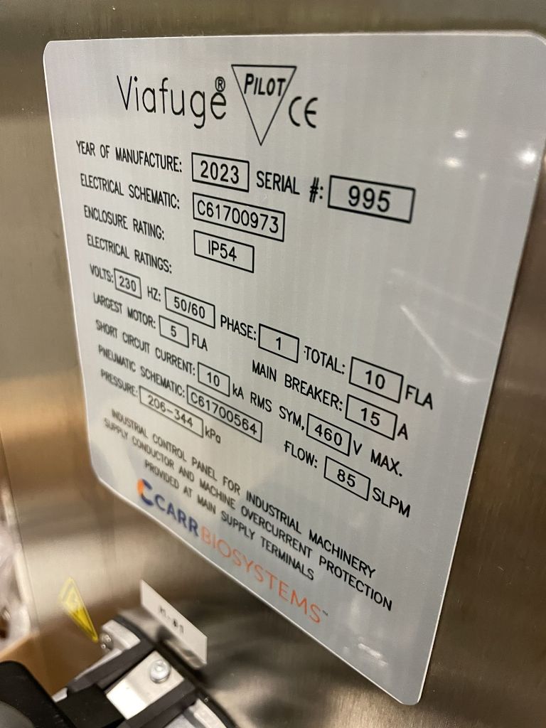 The Carr ViaFuge Pilot clarifier centrifuge, 316L SS. is engineered for high-efficiency separation processes, making it an ideal choice for various industrial applications. With a maximum bowl speed of 10,840 RPM, this centrifuge is capable of processing up to 240 liters per hour, ensuring rapid and effective clarification of liquids. The robust construction features 316L stainless steel, known for its excellent corrosion resistance and durability, which is further enhanced by a titanium bowl assembly. This combination of materials not only extends the lifespan of the equipment but also ensures that it can handle a wide range of chemical compositions without degradation. The temperature rating of 2-40°C allows for versatility in different operational environments, making it suitable for both laboratory and industrial settings.